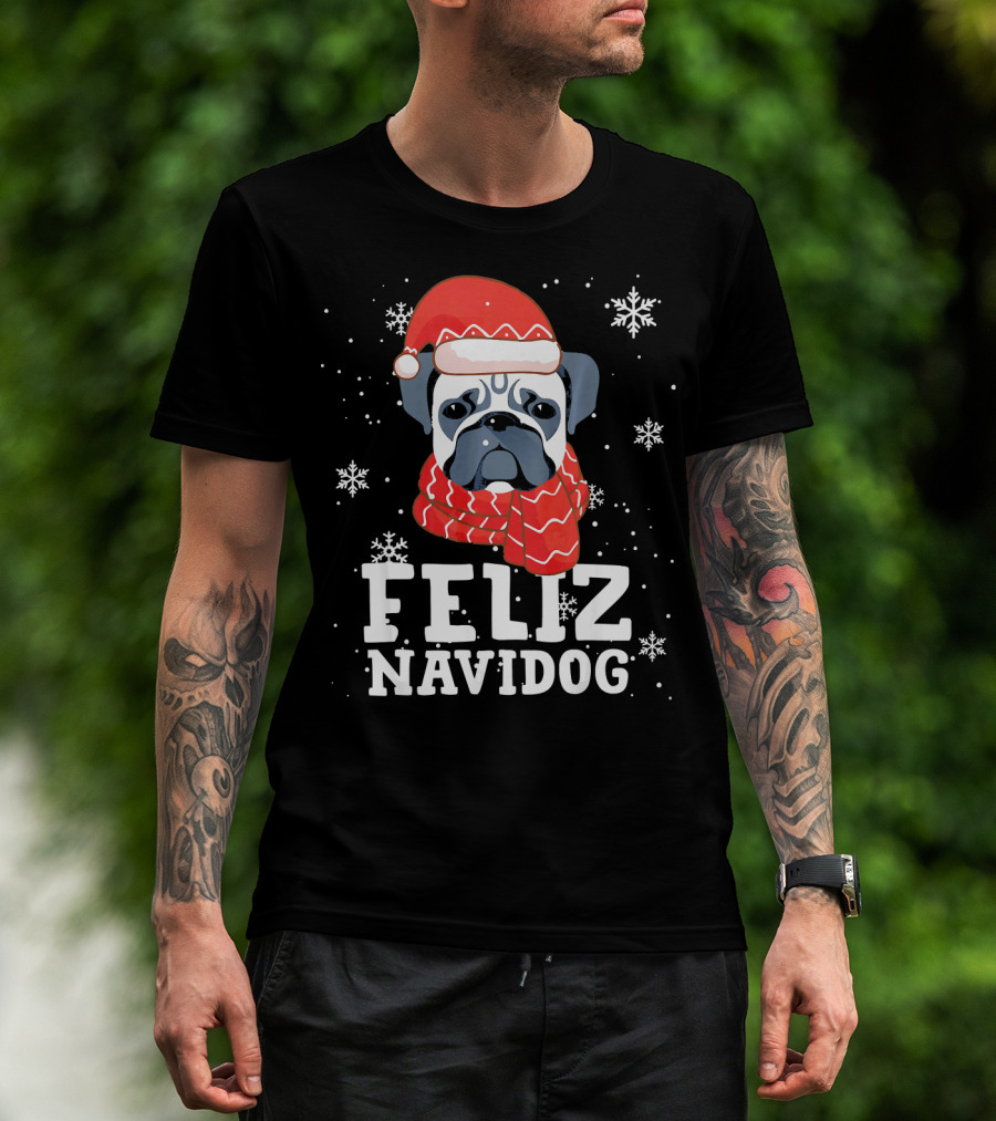Feliz Navidog Pug Dog With Santa Hat And Scarf Snowflakes T-Shirt