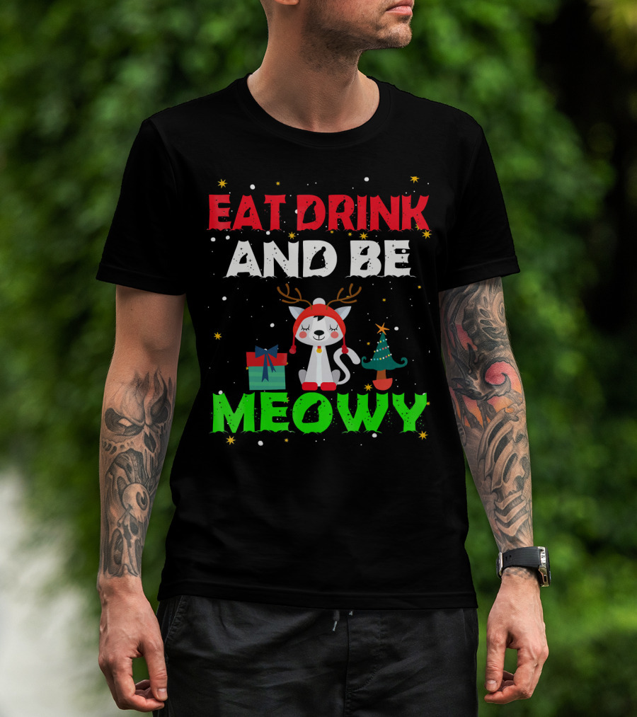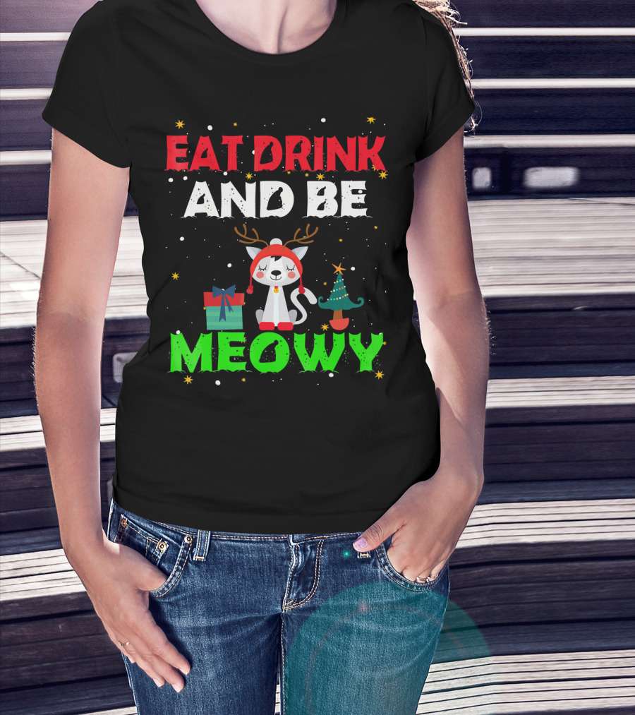 Eat Drink And Be Meowy Cat With Reindeer Antlers Holiday Motif T-Shirt