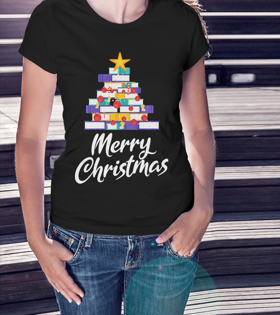 Merry Christmas Tree Stack Of Books Holiday Decor T-Shirt