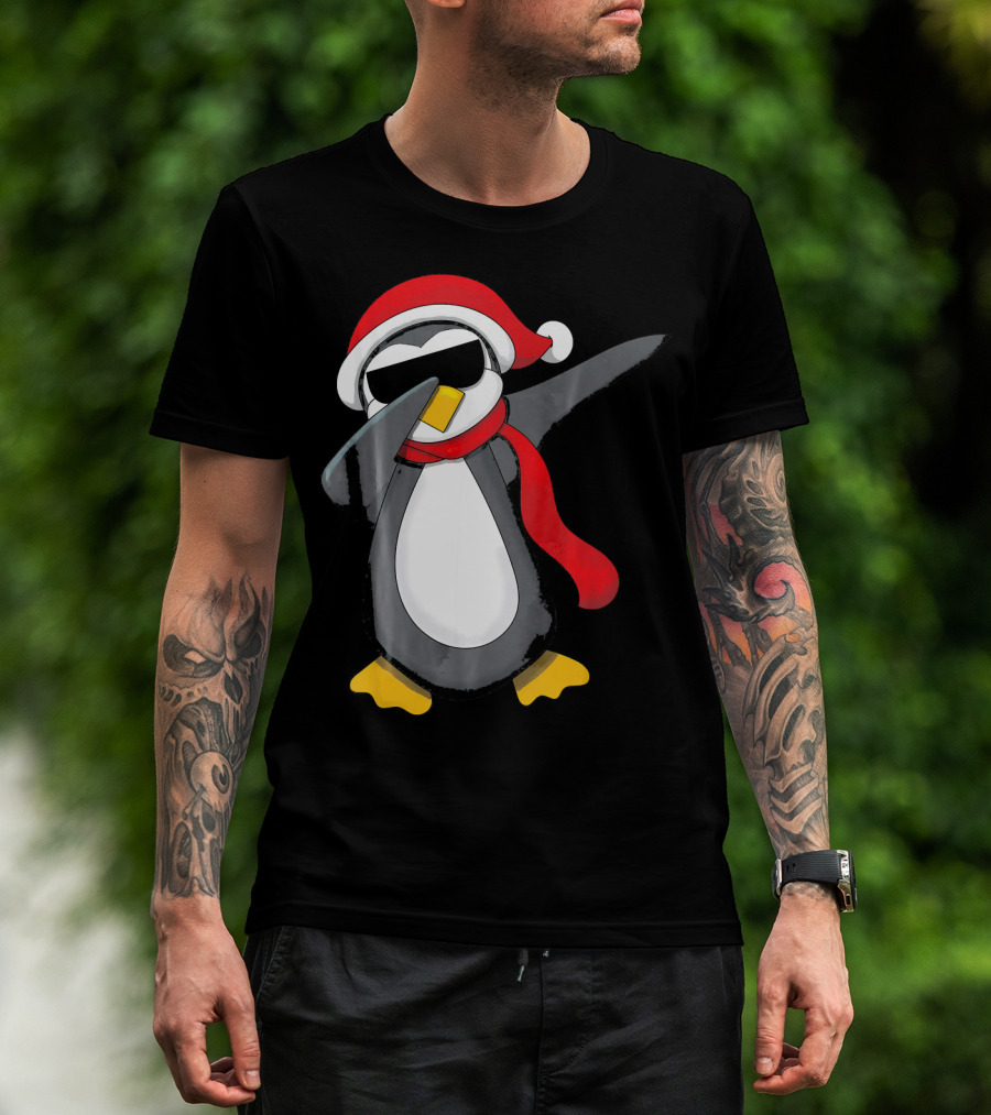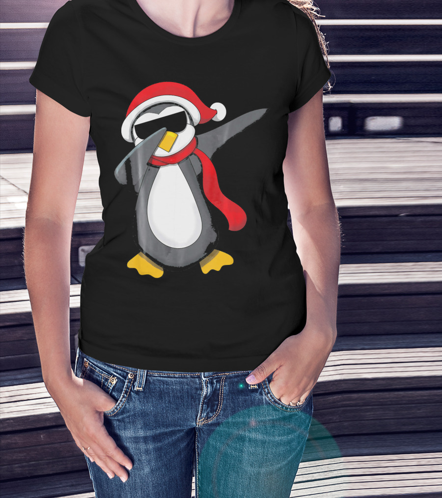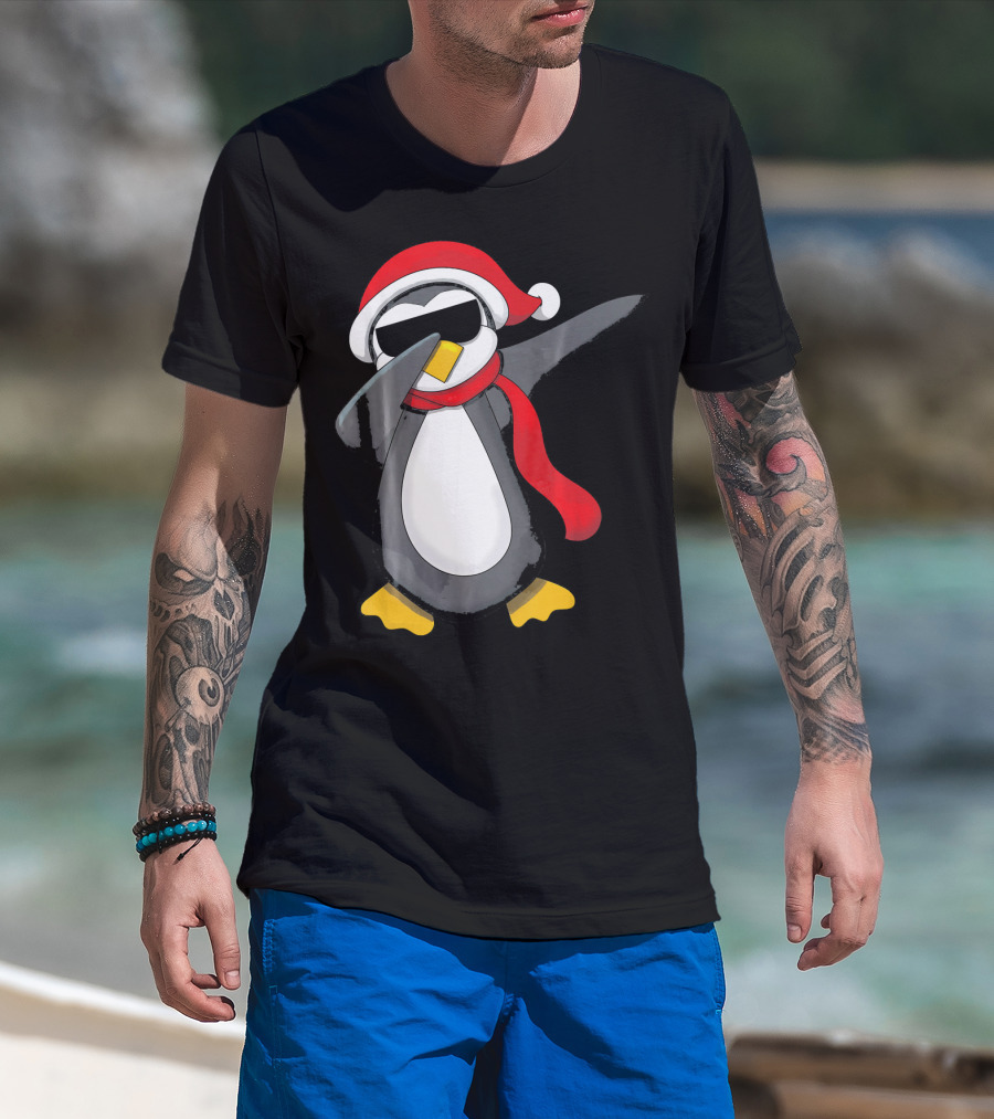 Dabbing Penguin Christmas Mornin Santa Hat Scarf Holiday Fun T-Shirt