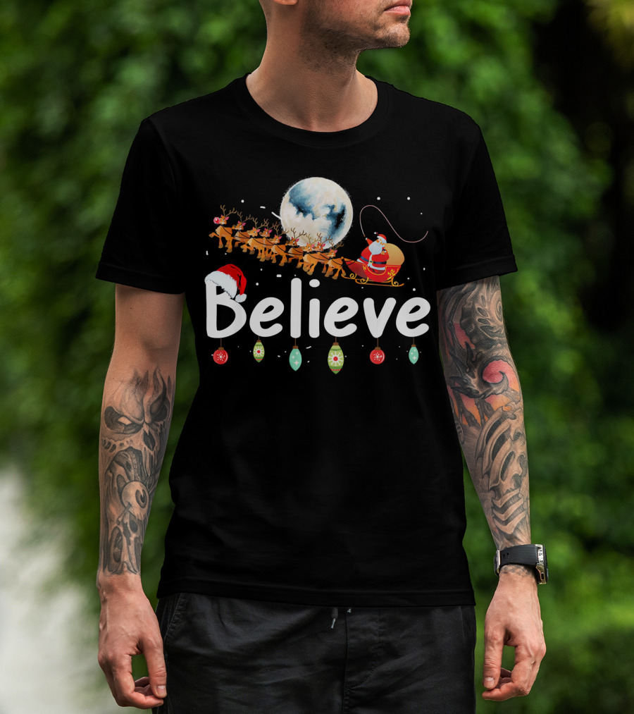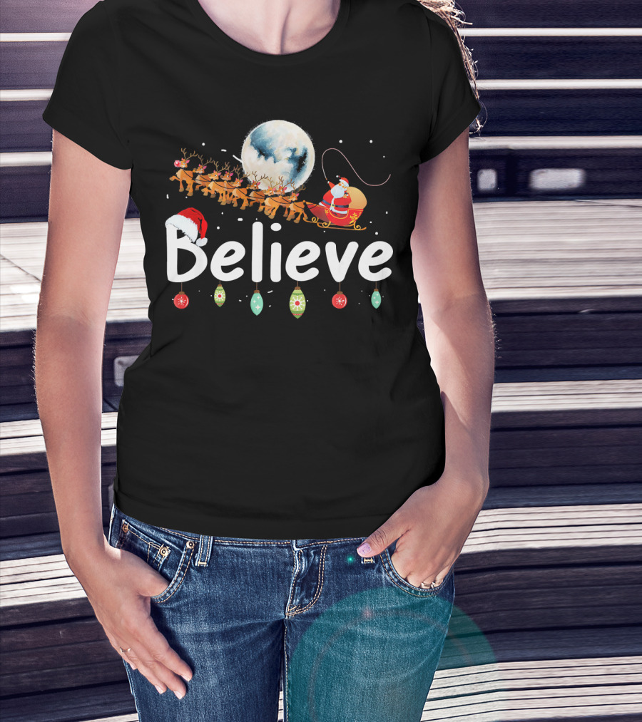 Believe Santa Sleigh Reindeer Moon Christmas Xmas T-Shirt