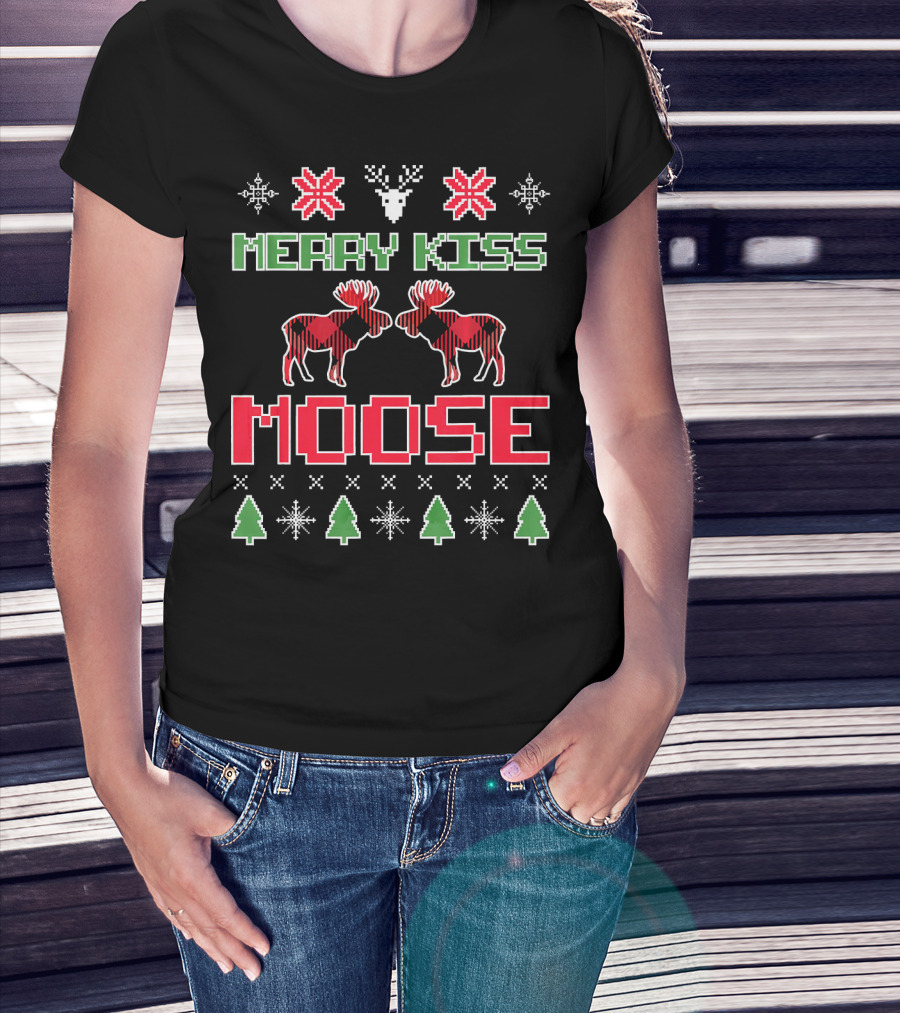MERRY KISS MOOSE CHRISTMAS UGLY SWEATER STYLE HOLIDAY MOOSE TREE SNOWFLAKE XMAS T-Shirt