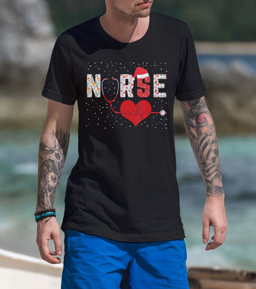 Nurse Christmas Heart Stethoscope Snowflakes Santa Hat T-Shirt
