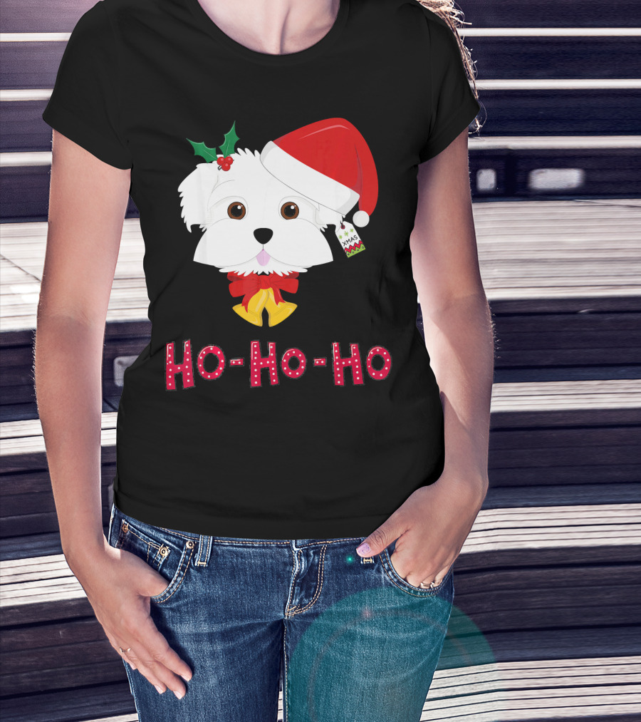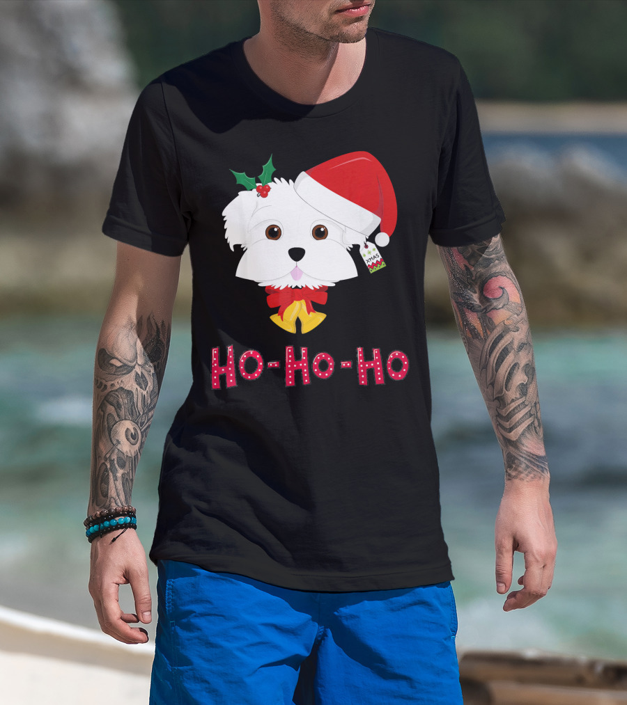 Maltese Dog In Santa Hat With Holly And Ho-Ho-Ho Text T-Shirt