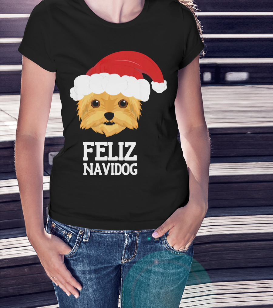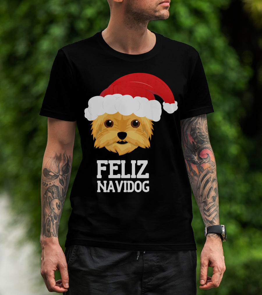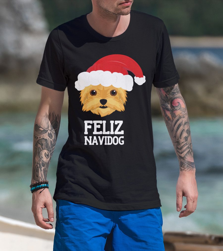 Feliz Navidog Merry Christmas Yorksh Dog Santa Hat T-Shirt