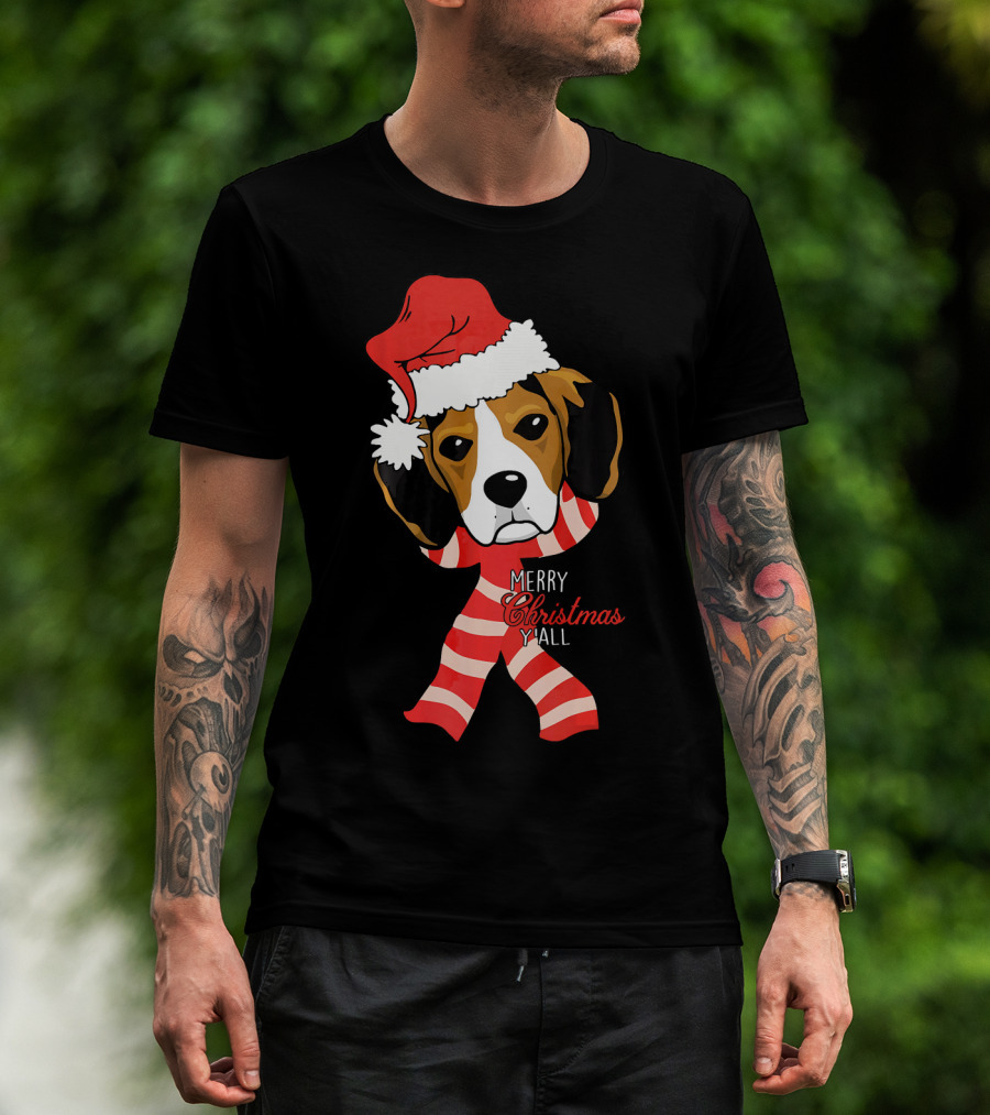 Merry Christmas Y'all Beagle Dog In Santa Hat And Striped Pajamas T-Shirt