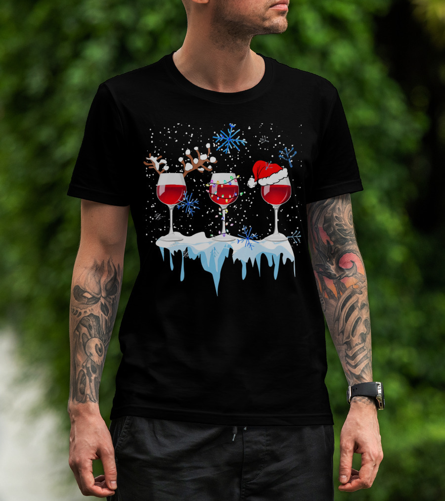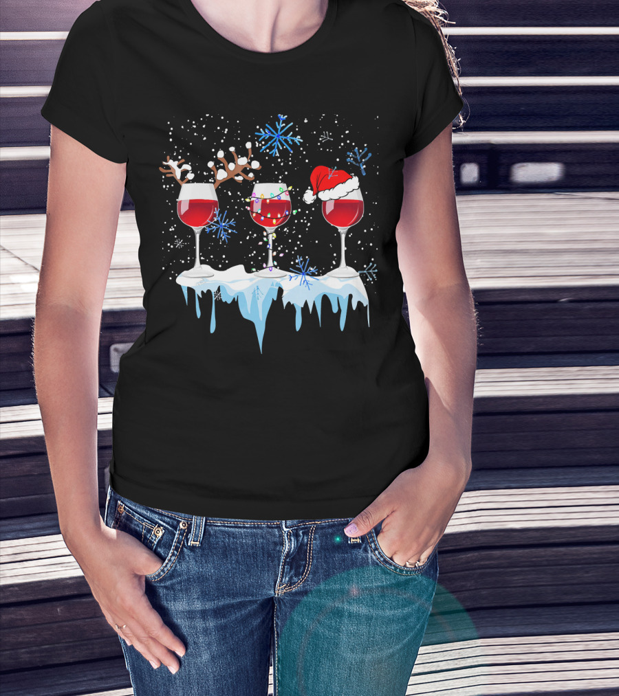 Christmas Reindeer Wine Glasses Santa Hat Snowflakes Holiday T-Shirt