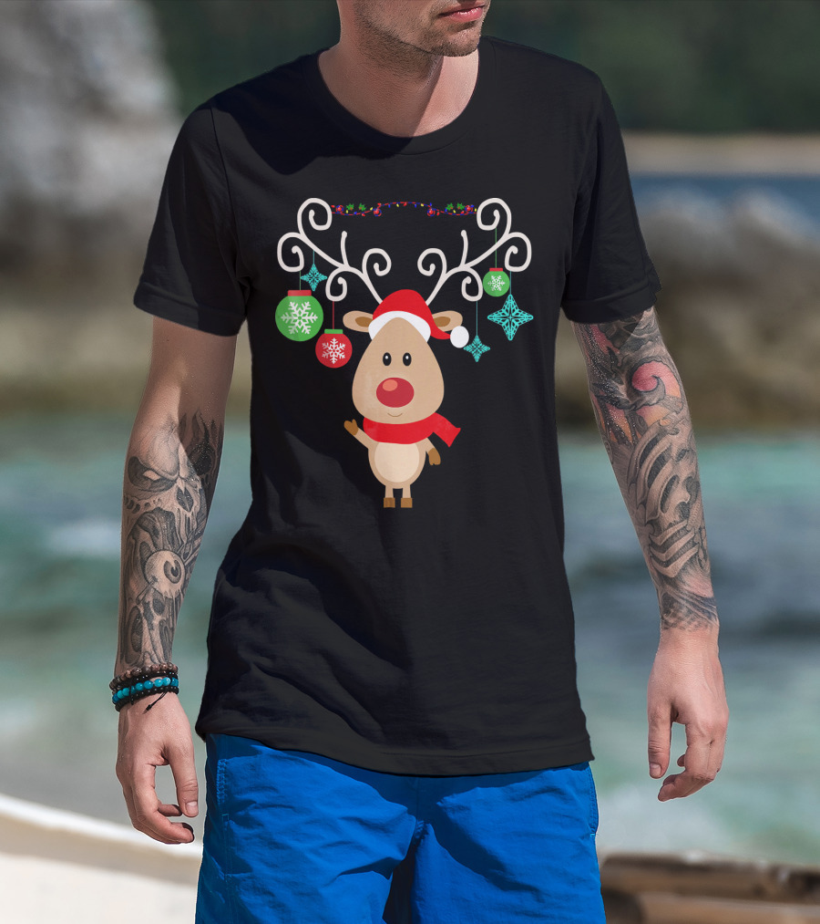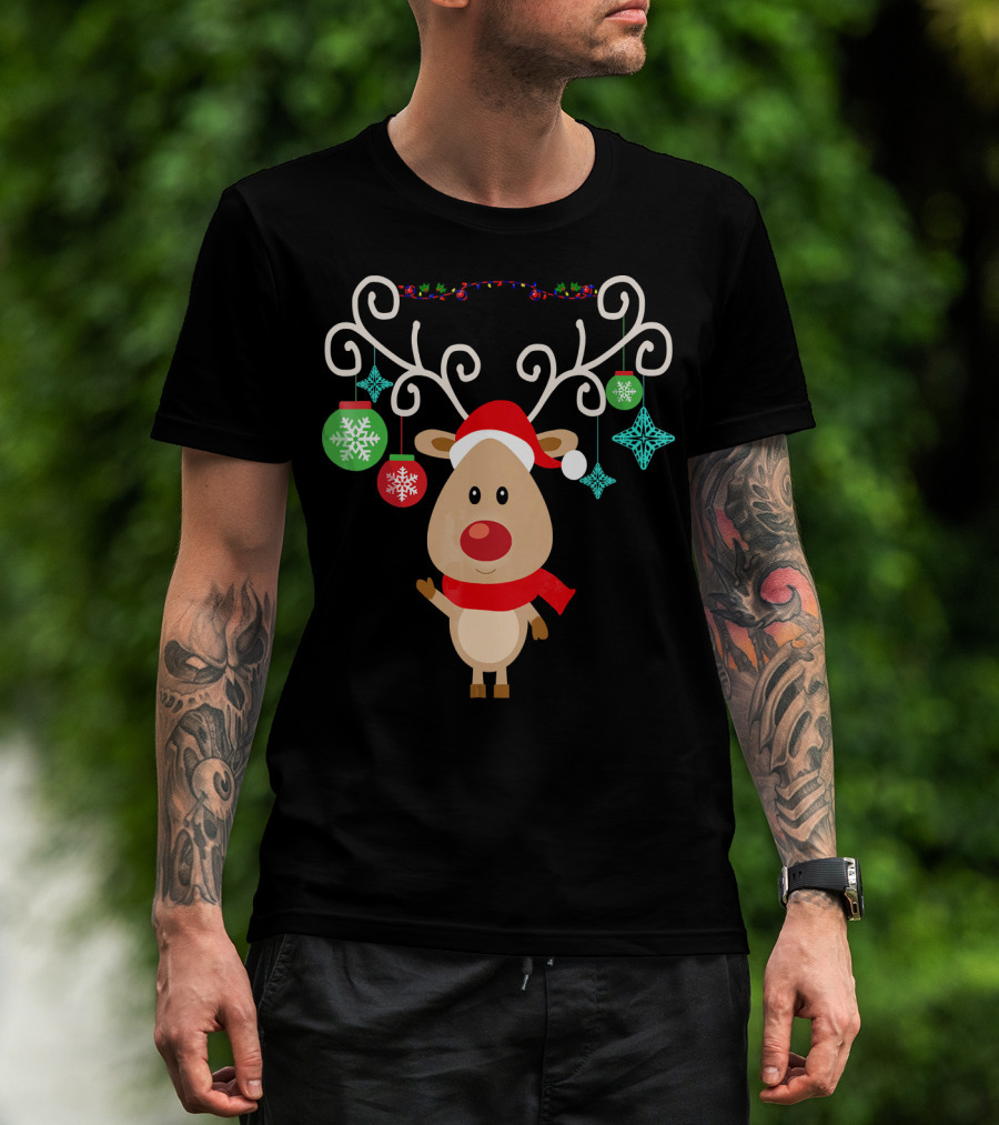 Santa Hat Rudolph Reindeer With Christmas Ornaments Red Nose T-Shirt