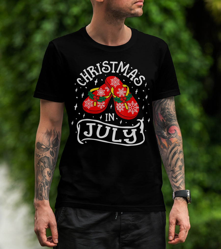 Christmas In July Flip Flops Humor Holiday Snowflakes And Holly T-Shirt