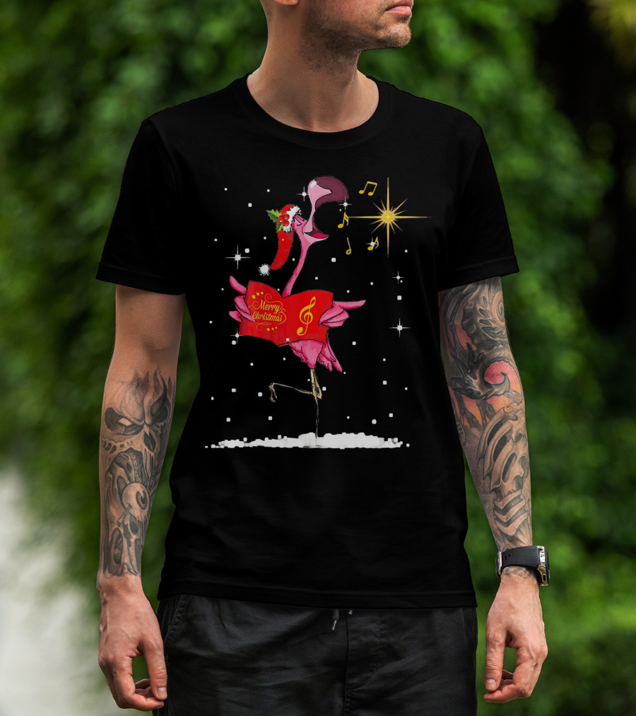 Funny Flamingo Sings Merry Christmas Song With Musical Notes And Santa Hat T-Shirt