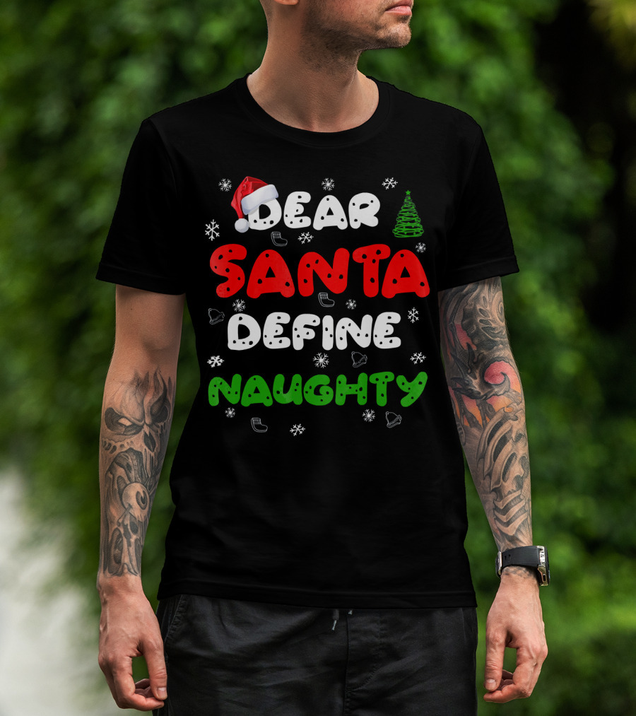 Dear Santa Define Naughty Christmas Hat Snowflakes Green Tree T-Shirt