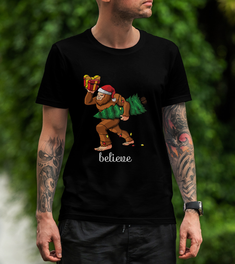 Believe Bigfoot Christmas Tree Sasquatch Santa Hat Gift T-Shirt