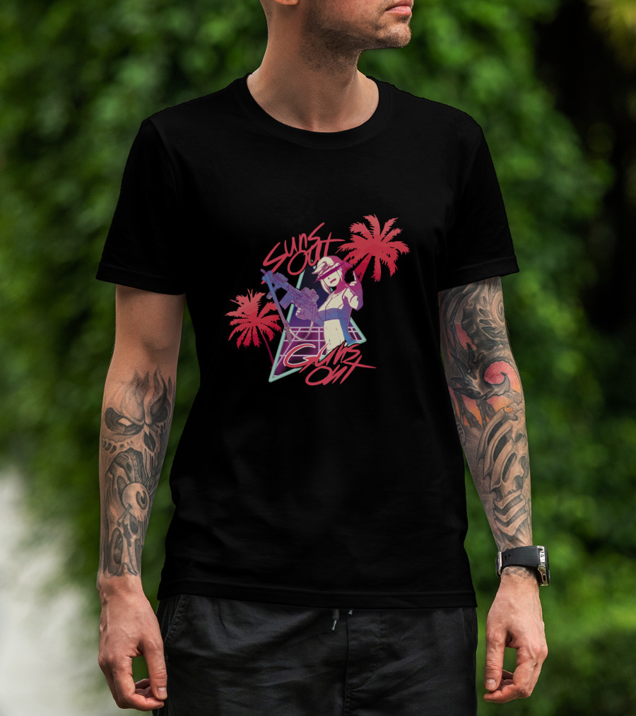 The Suns Out Guns Out Retro Palm Trees Neon T-shirt is designed for everyday wear and a consistent fit. Fabric is pre-shrunk ring-spun cotton with durable stitching. See the size chart below for exact measurements.