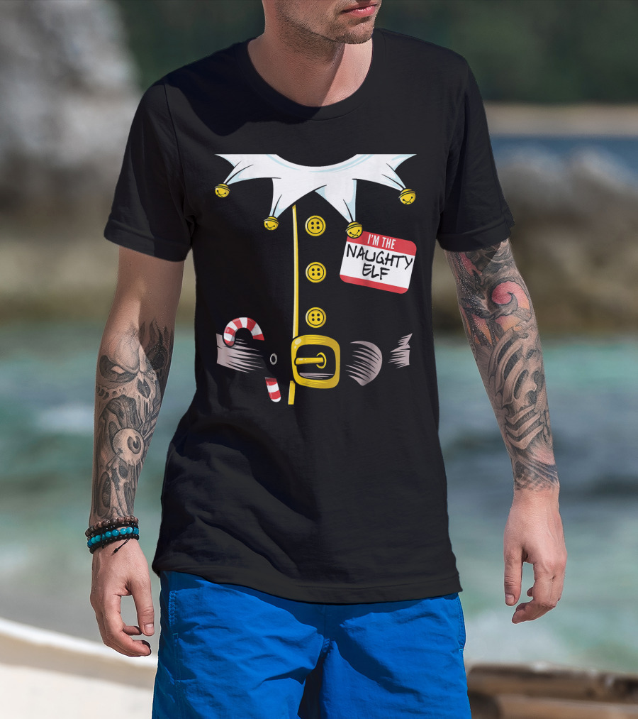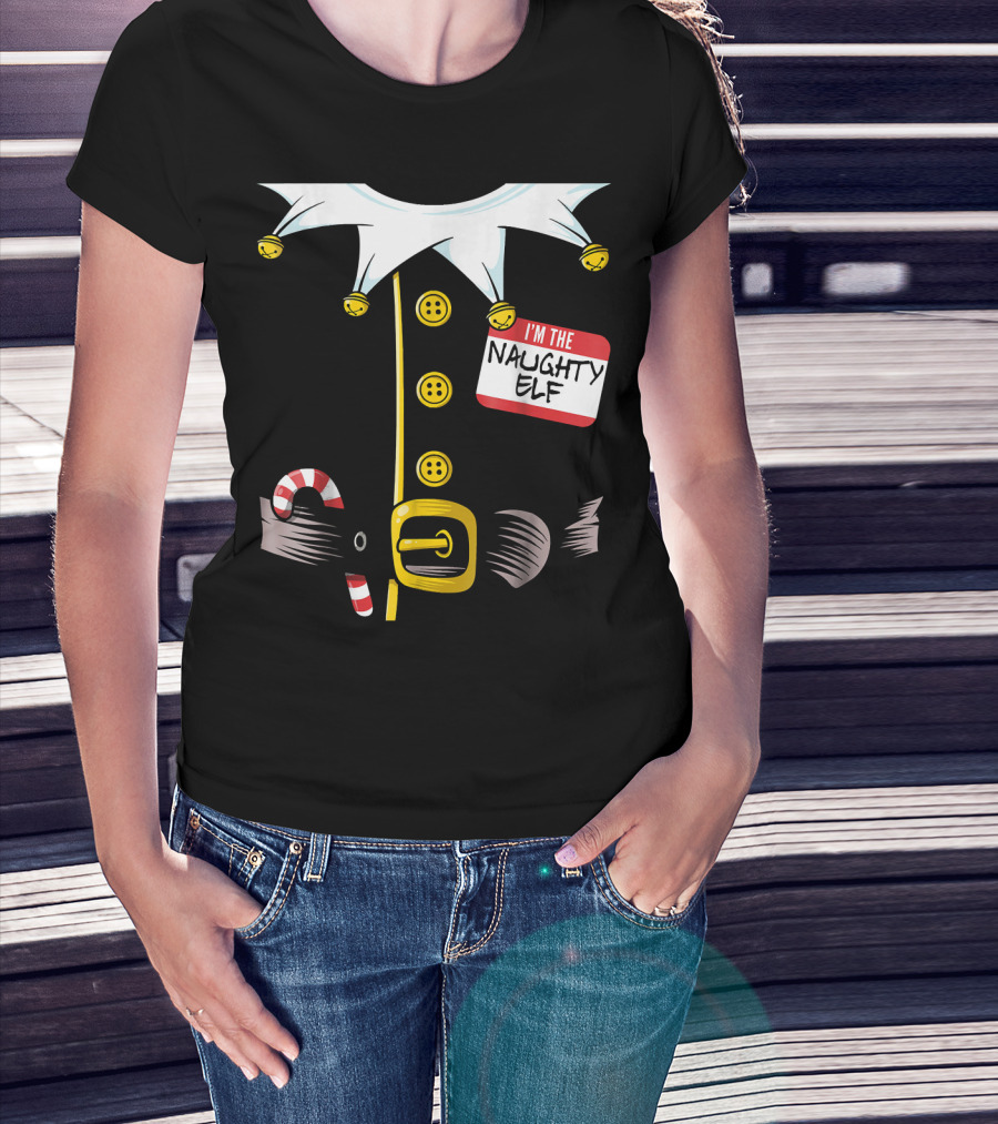 The I'm The Naughty Elf with Candy Cane and Bell Collar T-shirt is designed for everyday wear and a consistent fit. Fabric is pre-shrunk ring-spun cotton with durable stitching. See the size chart below for exact measurements.