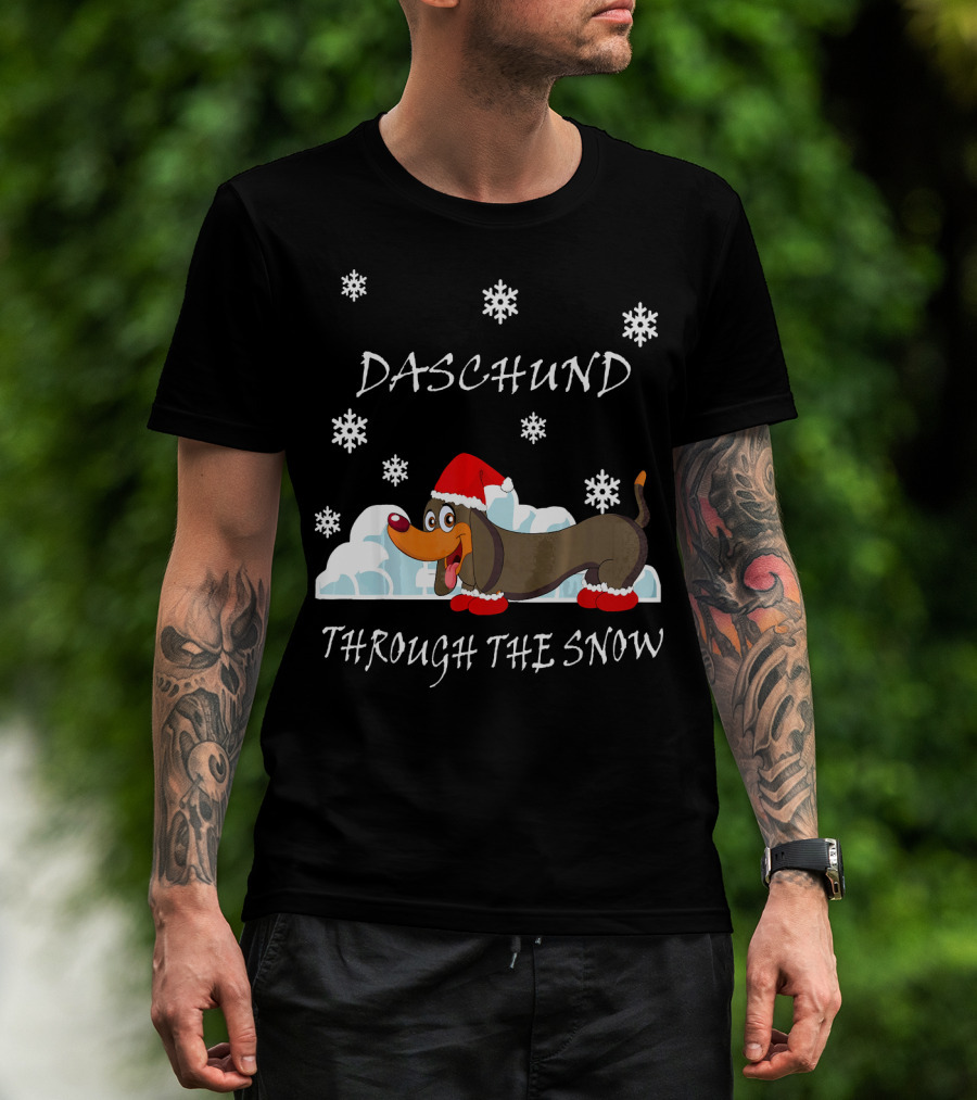Daschund Through The Snow Santa Hat Snowflakes T-Shirt