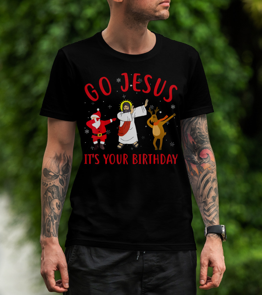 The Go Jesus Its Your Birthday Santa Reindeer Dance T-shirt is designed for everyday wear and a consistent fit. Fabric is pre-shrunk ring-spun cotton with durable stitching. See the size chart below for exact measurements.