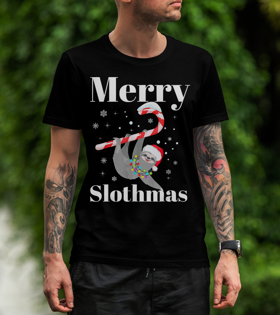 Merry Slothmas Christmas Sloths Candy Cane Santa Hat Snowflakes T-Shirt
