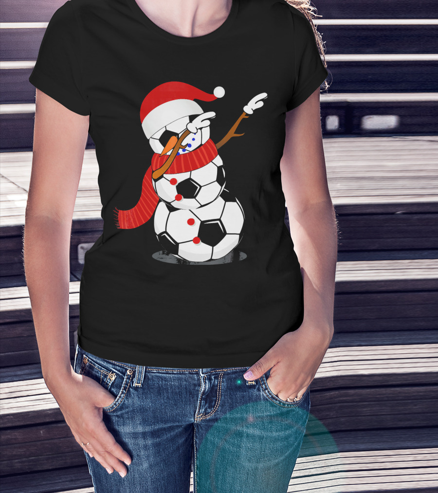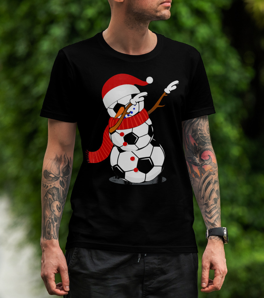 Festive Soccer Ball Dabbing Snowman With Santa Hat And Scarf T-Shirt