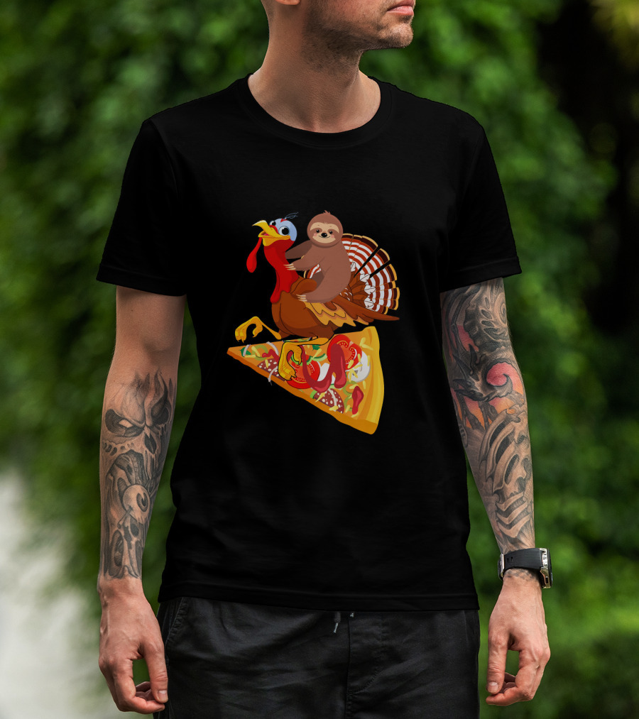 Sloth Riding Turkey On Pizza Slice Surreal Fun T-Shirt