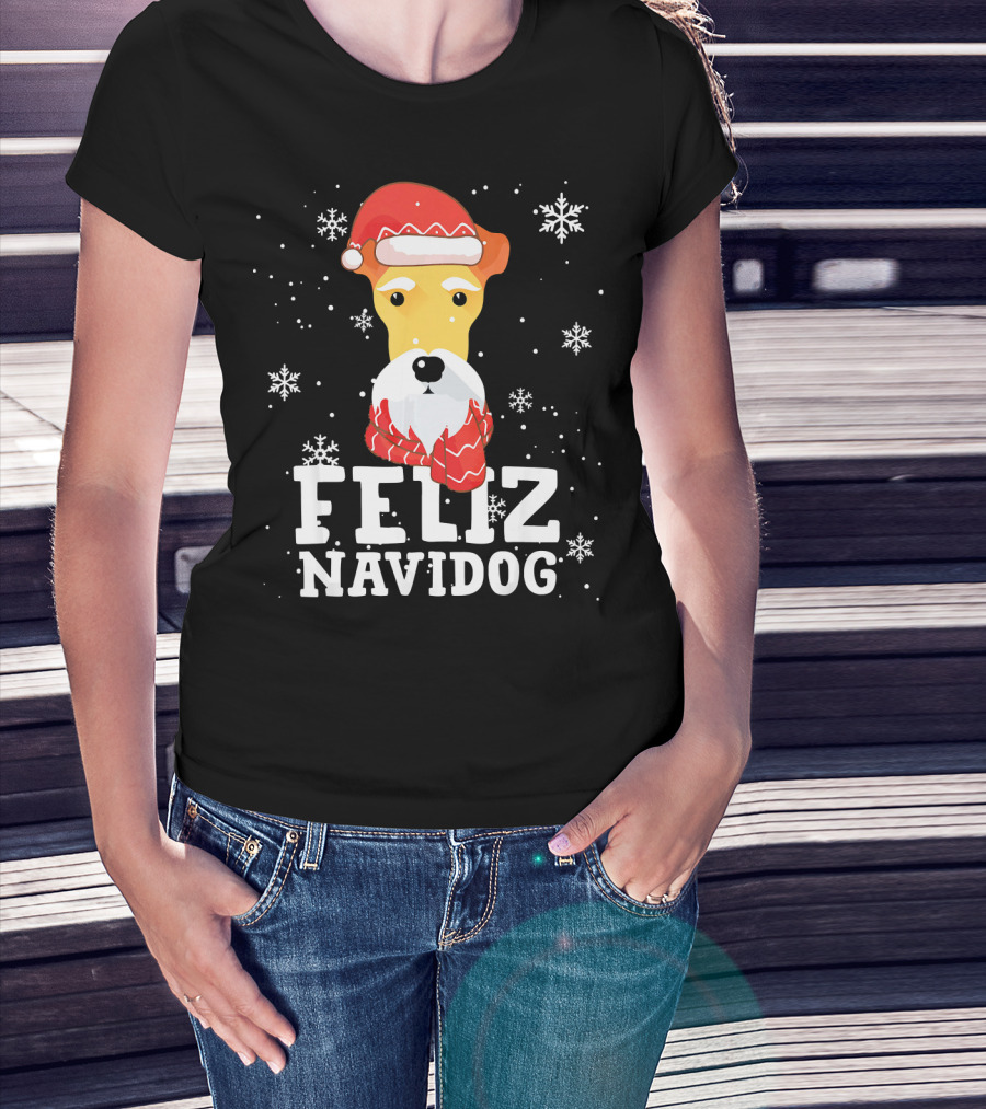 Feliz Navidog Fox Terrier Wire Dog Santa Hat Snowflakes T-Shirt