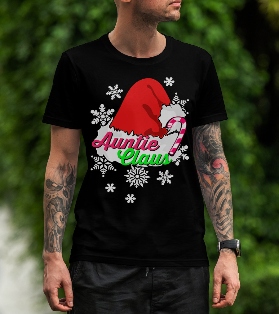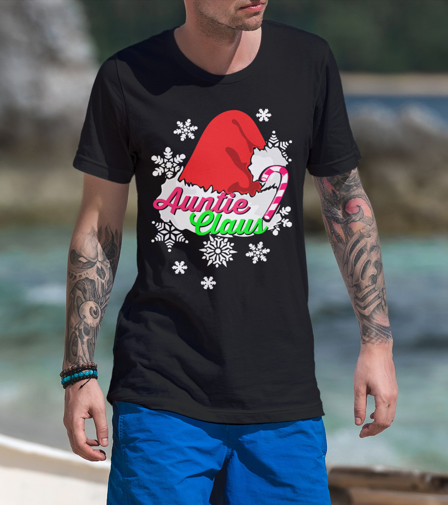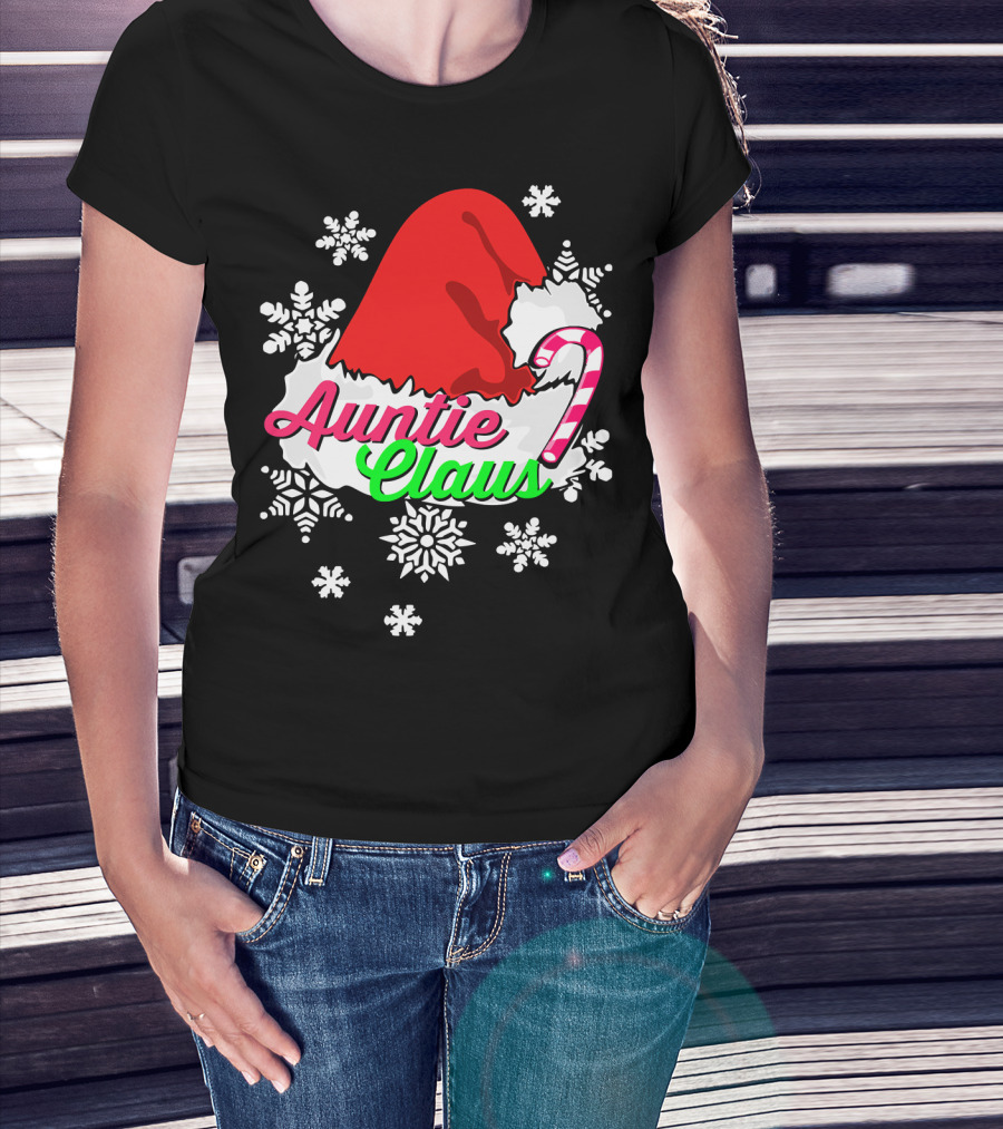 Auntie Claus Christmas Candy Cane Snowflakes Santa Hat T-Shirt