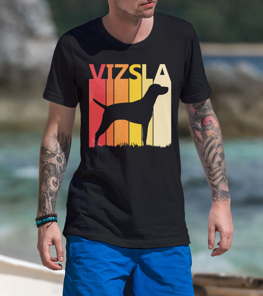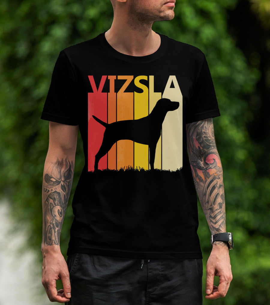 The Retro Vizsla Dog Silhouette with Gradient Stripes T-shirt is designed for everyday wear and a consistent fit. Fabric is pre-shrunk ring-spun cotton with durable stitching. See the size chart below for exact measurements.