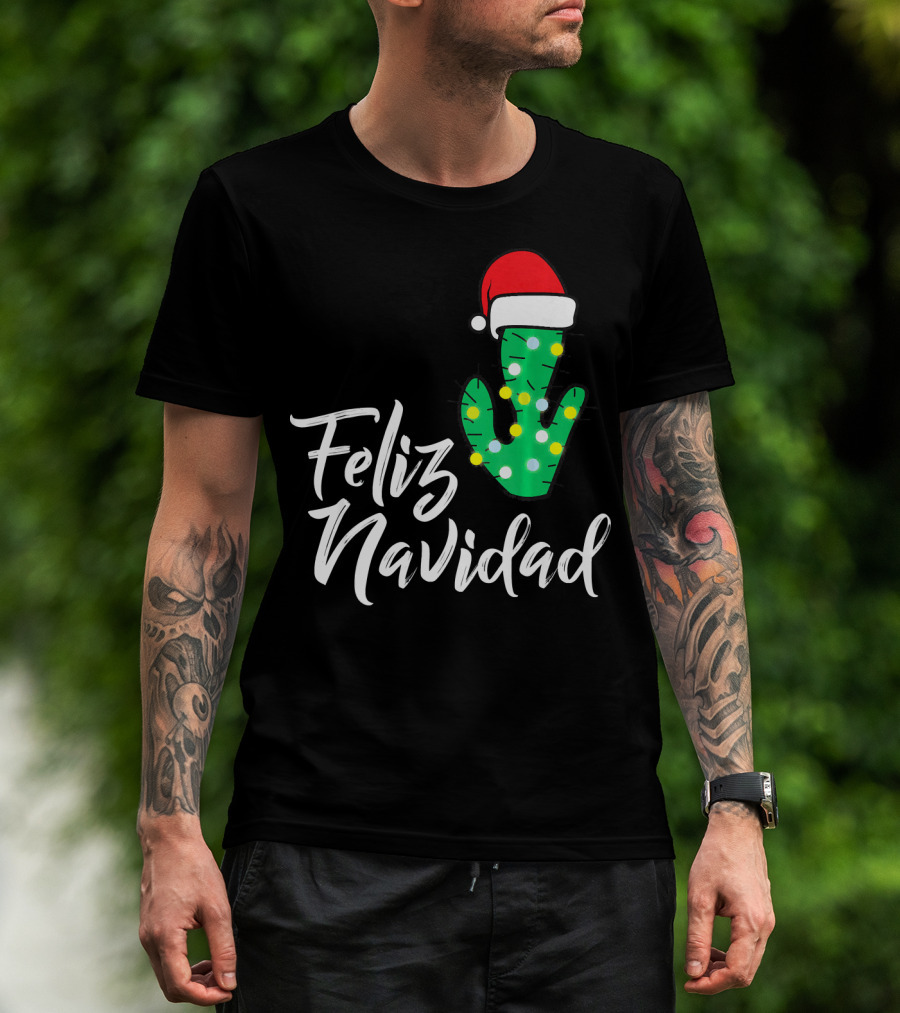 Feliz Navidad Cactus With Santa Hat And Christmas Lights T-Shirt