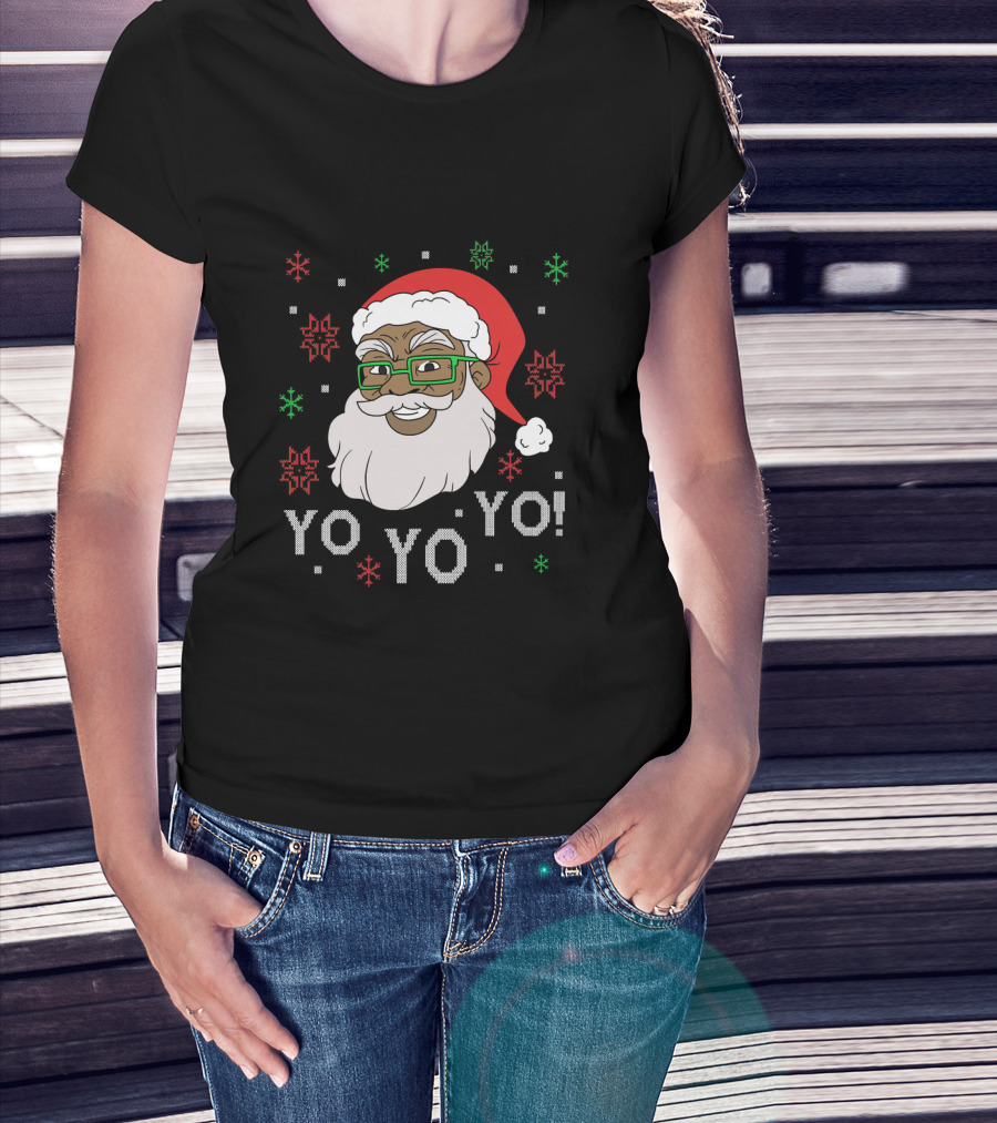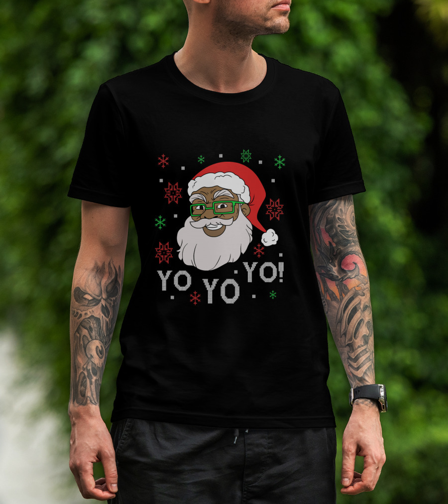 Yo Yo Yo Fun Black Santa Claus Christmas Snowflakes Glasses T-Shirt
