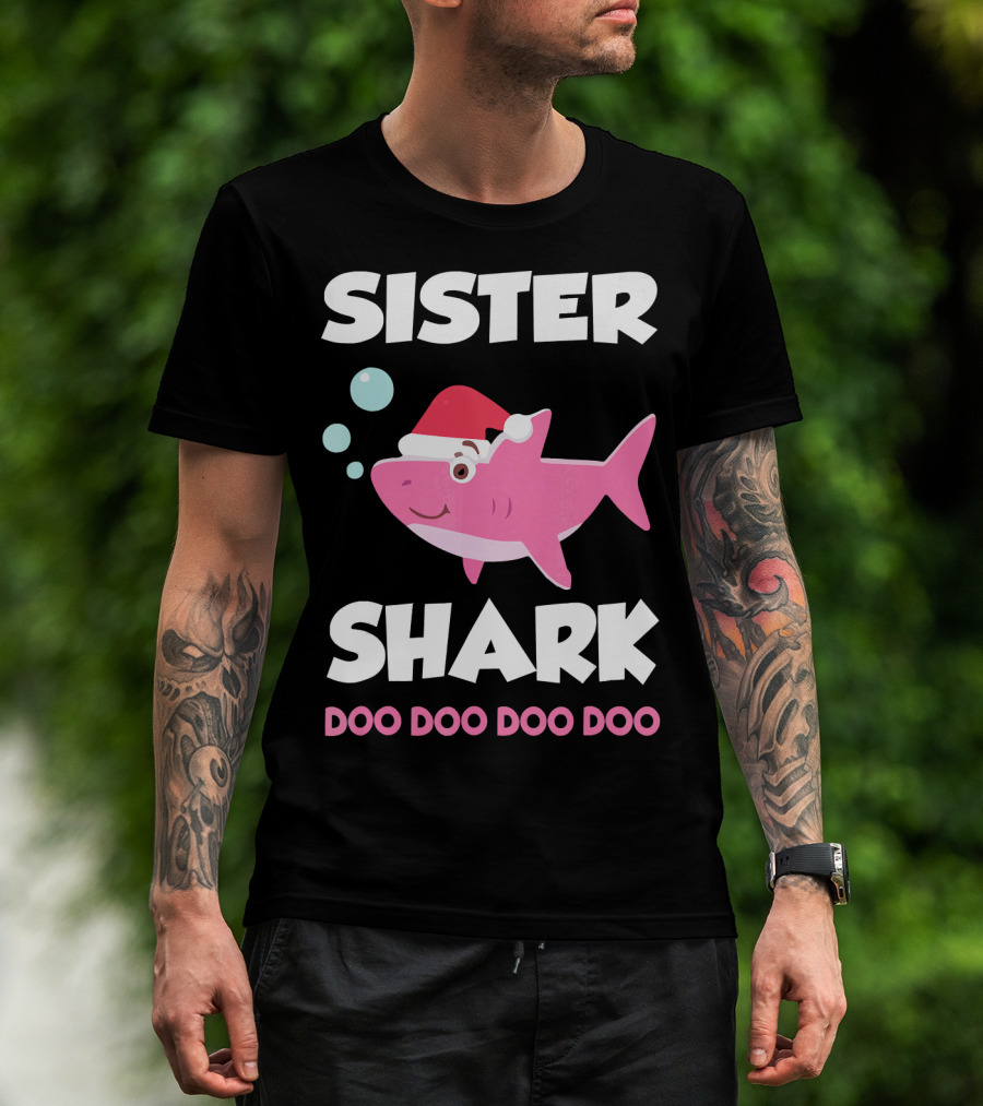 The Sister Shark Doo Doo Doo Doo Christmas Hat Bubbles T-shirt is designed for everyday wear and a consistent fit. Fabric is pre-shrunk ring-spun cotton with durable stitching. See the size chart below for exact measurements.