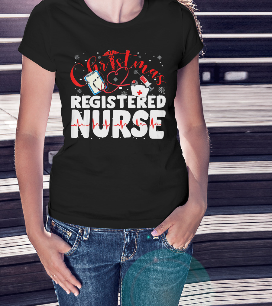 Christmas Registered Nurse With Medical Icons And Heartbeat T-Shirt