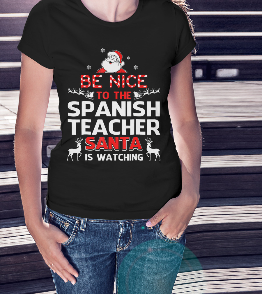 Be Nice To The Spanish Teacher Santa Is Watching Festive Holiday Shirt With Santa And Reindeer T-Shirt