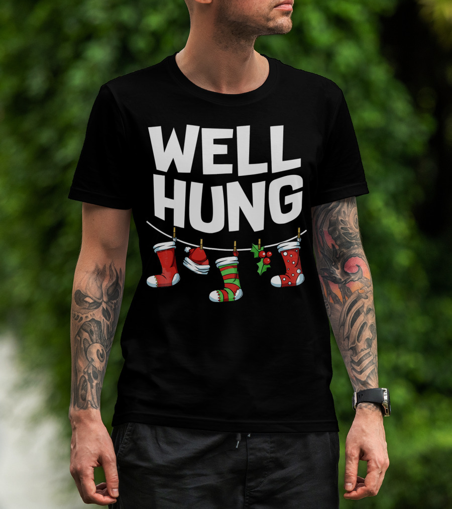 Well Hung Christmas Socks Holder With Festive Hanging Stockings T-Shirt