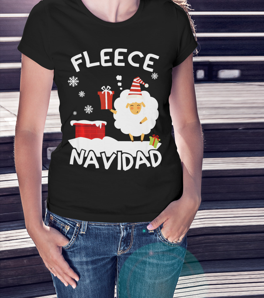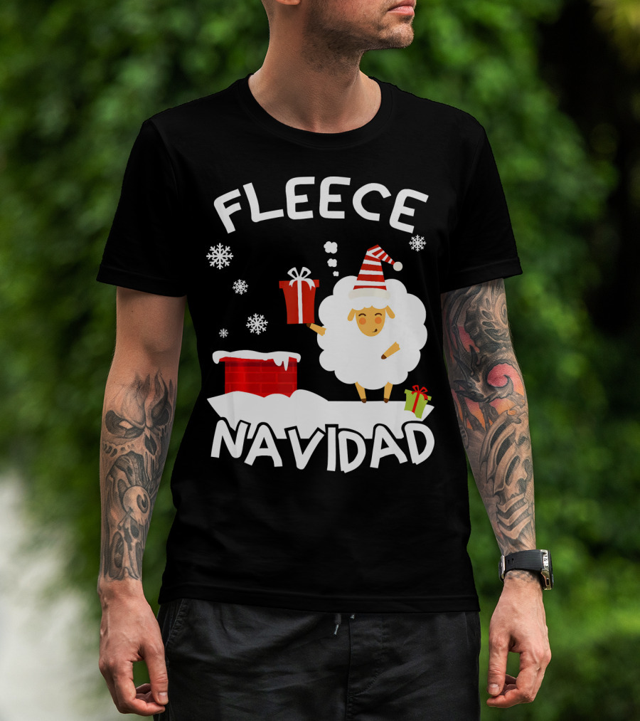 Fleece Navidad Sheep With Santa Hat And Gift Chimney Snowflakes T-Shirt