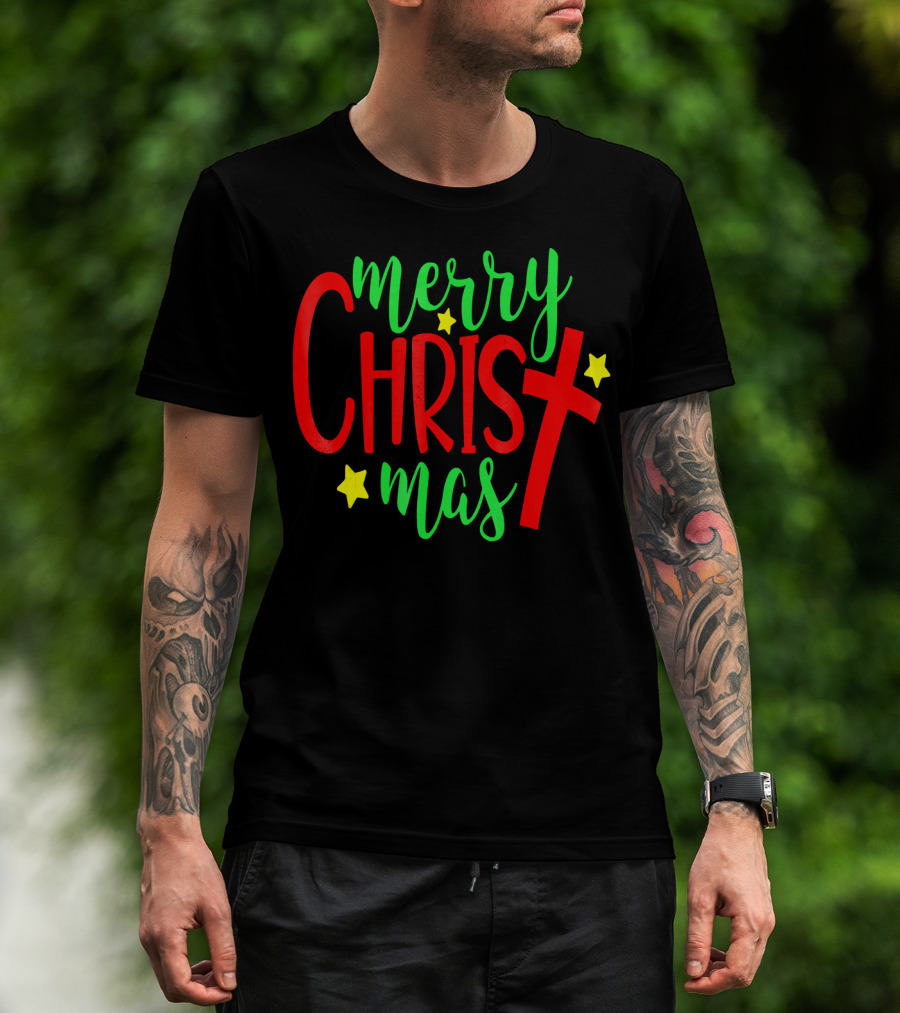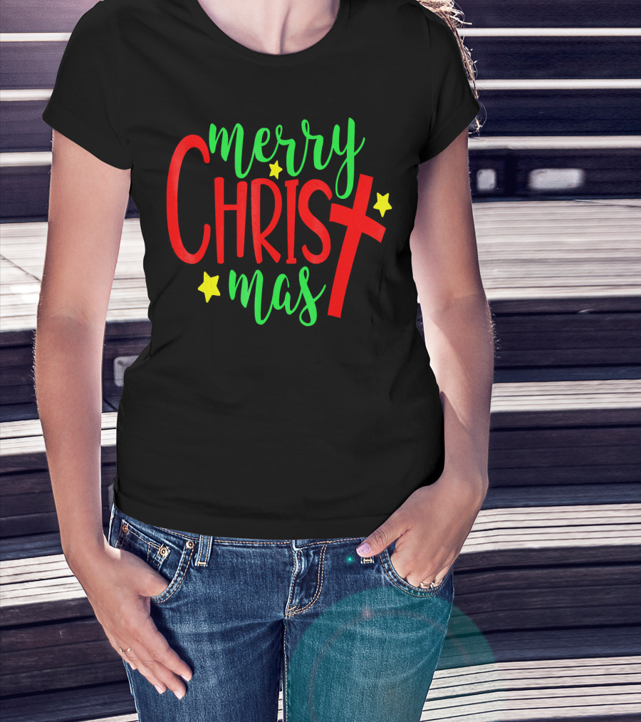 The Merry Christmas Christian Cross Stars T-shirt is designed for everyday wear and a consistent fit. Fabric is pre-shrunk ring-spun cotton with durable stitching. See the size chart below for exact measurements.