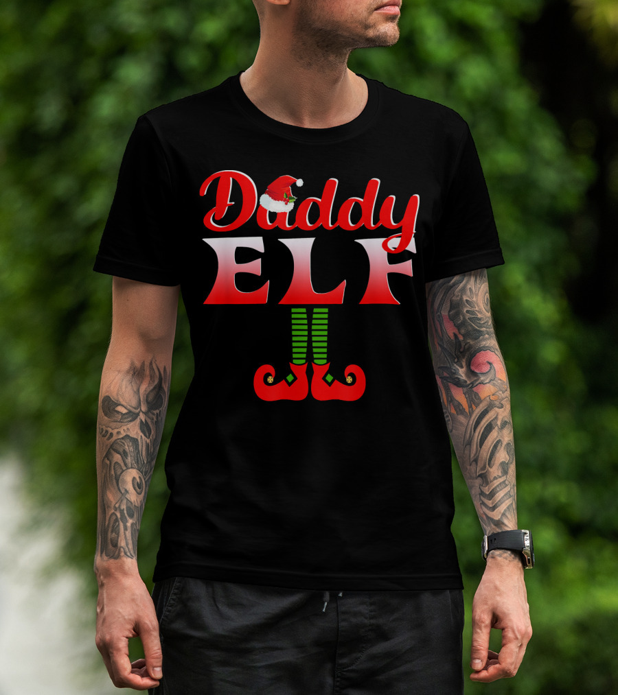 Daddy Elf Santa Hat Striped Socks Red Shoes Holiday Fun T-Shirt