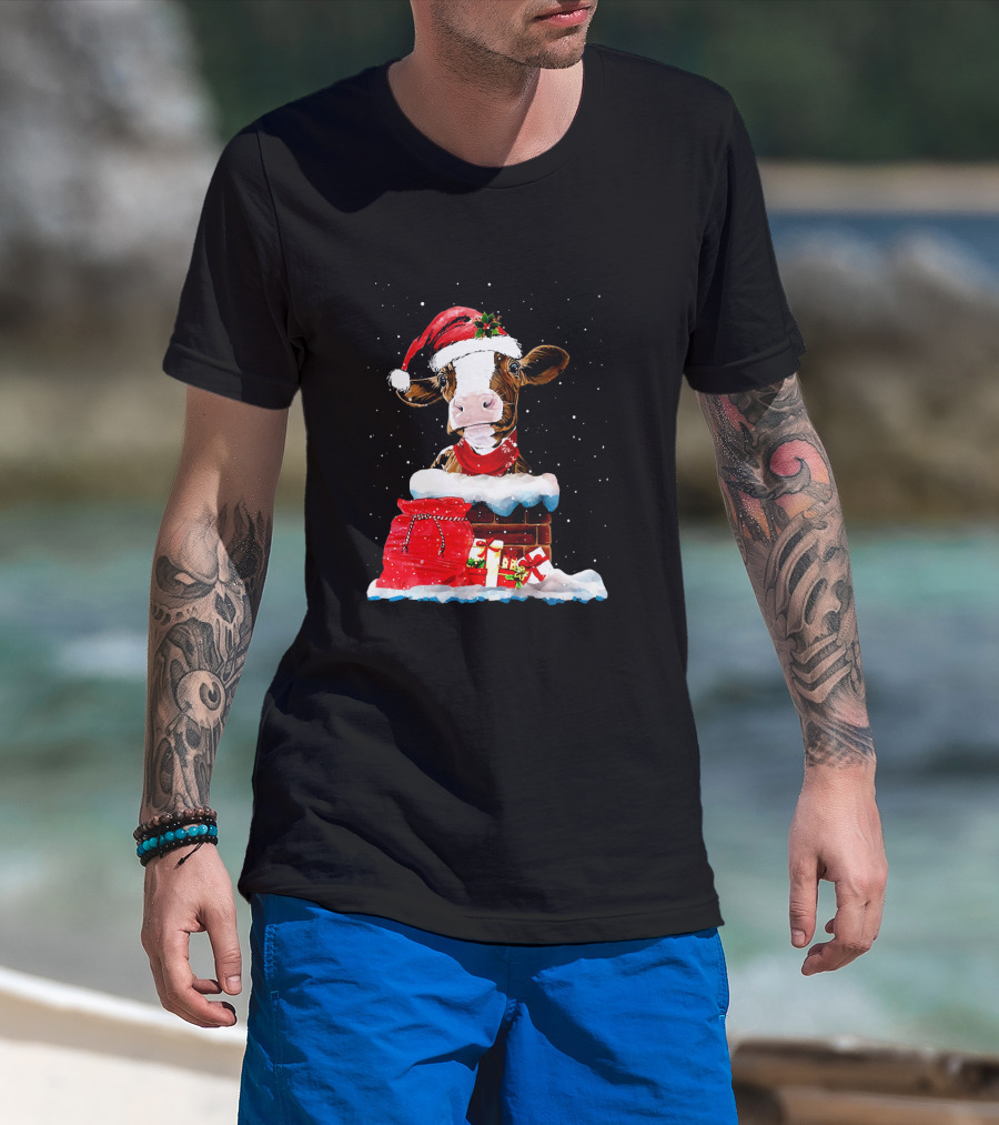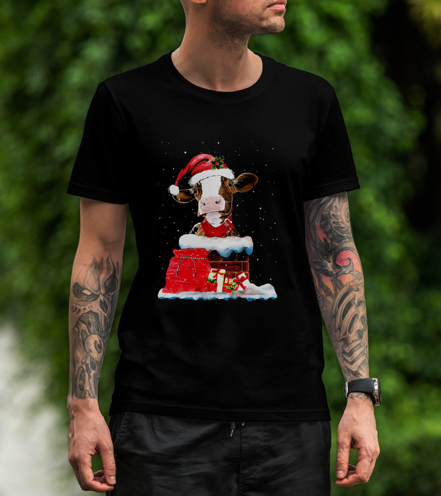 Cow With Santa Hat In Chimney And Christmas Gifts T-Shirt