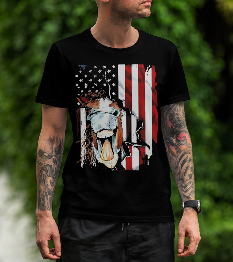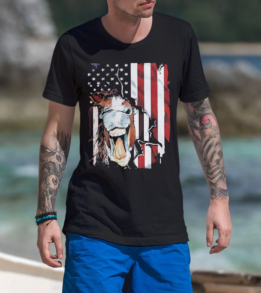 The Horse Face American Flag Heritage T-shirt is designed for everyday wear and a consistent fit. Fabric is pre-shrunk ring-spun cotton with durable stitching. See the size chart below for exact measurements.