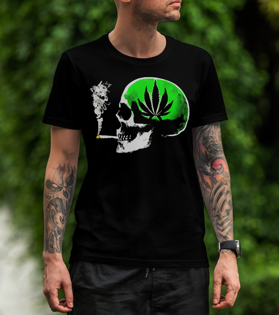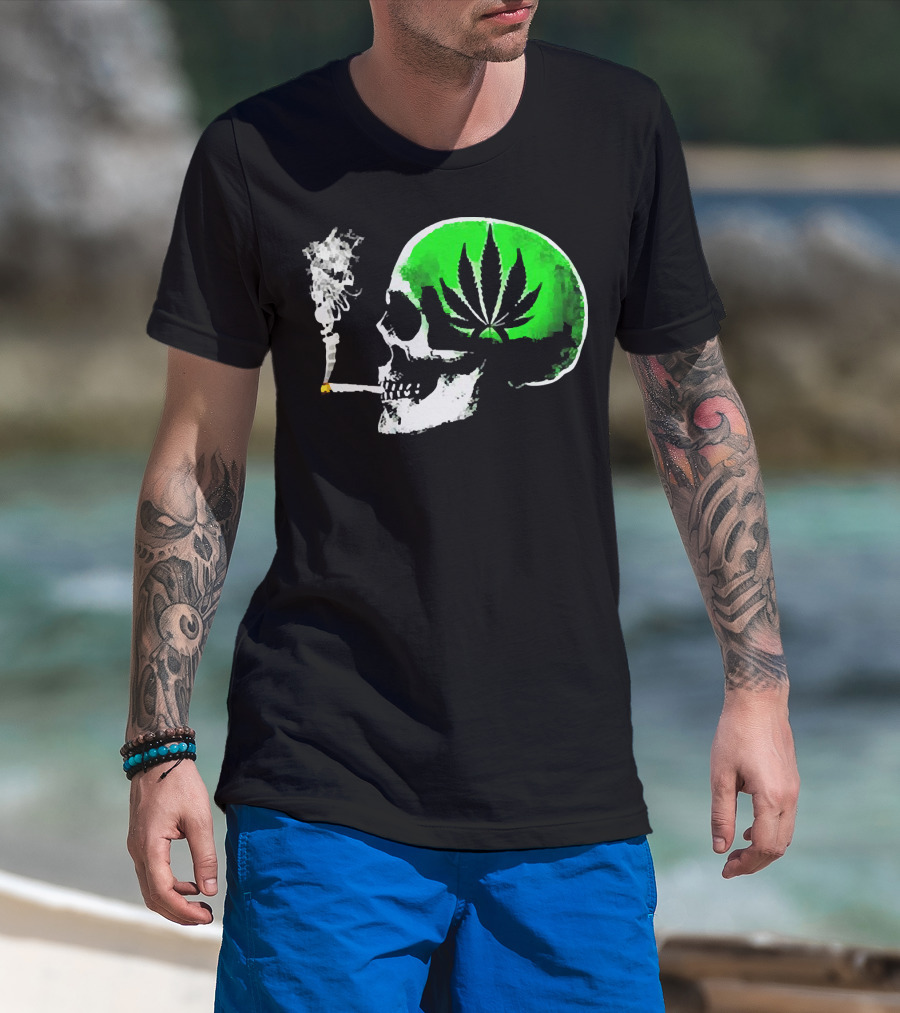 Weed Leaves Skull Smoking Joint Green Marijuana T-Shirt