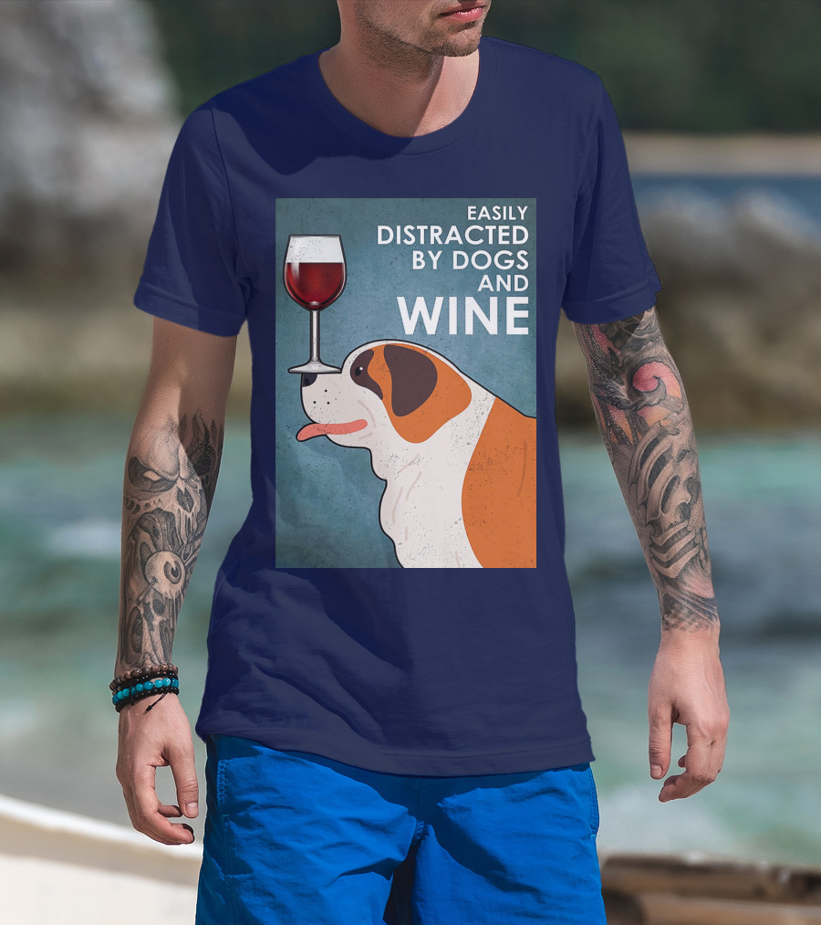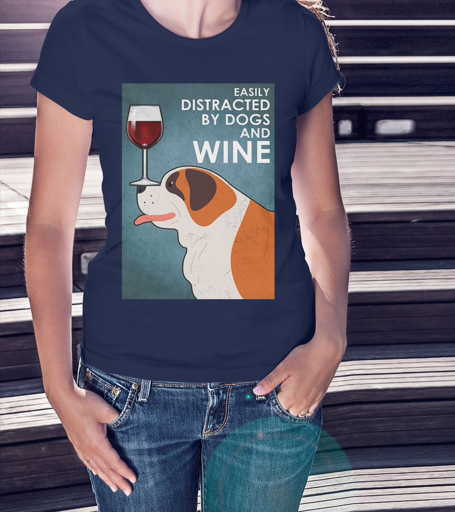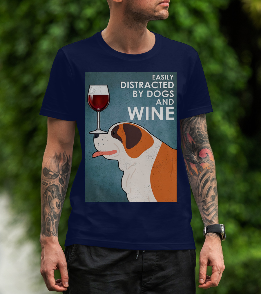 St Bernard Easily Distracted By Dogs And Wine With Red Wine Glass T-Shirt