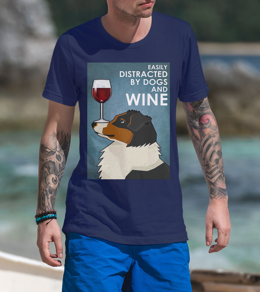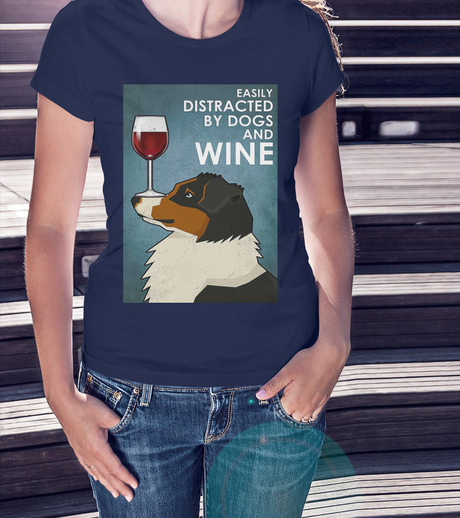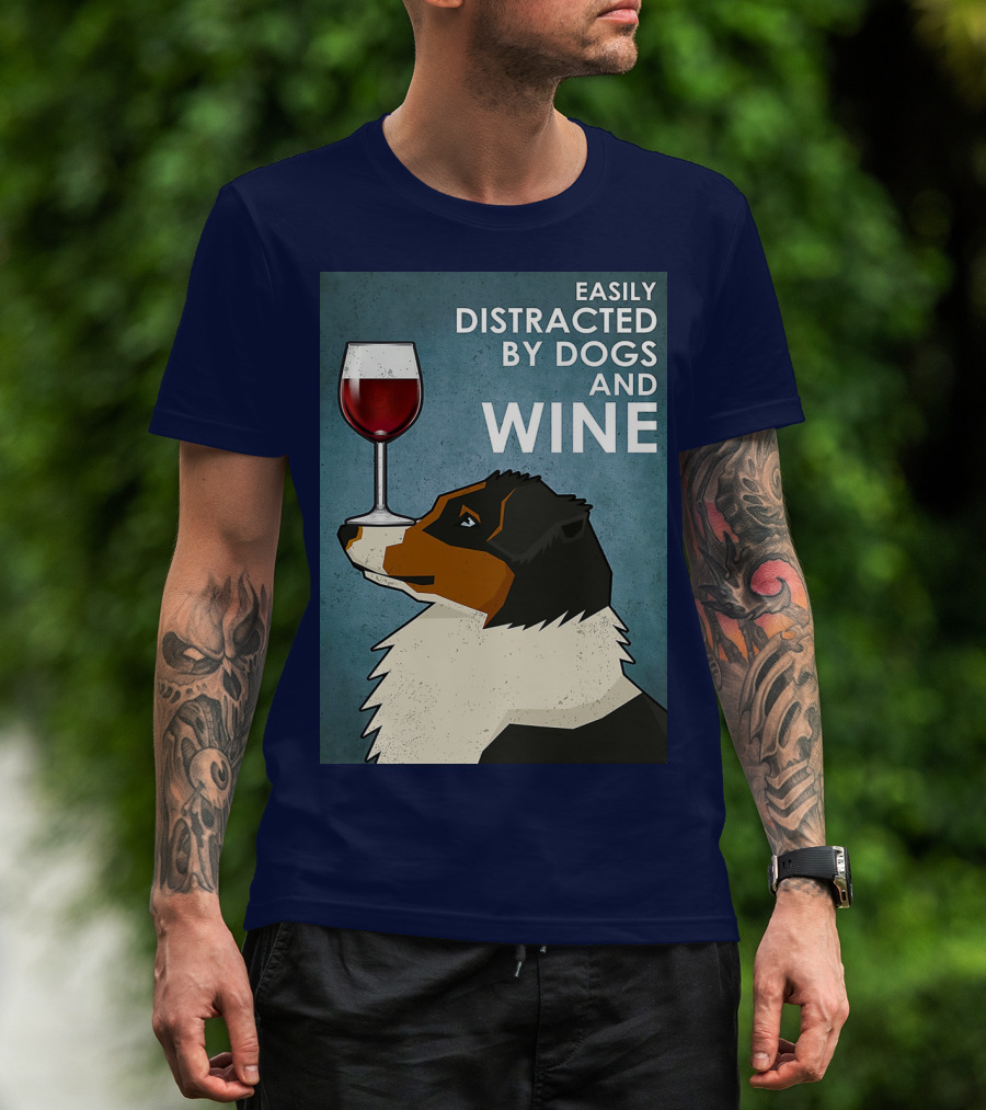 Easily Distracted By Dogs And Wine Australian Shepherd With Glass Balancing Act T-Shirt