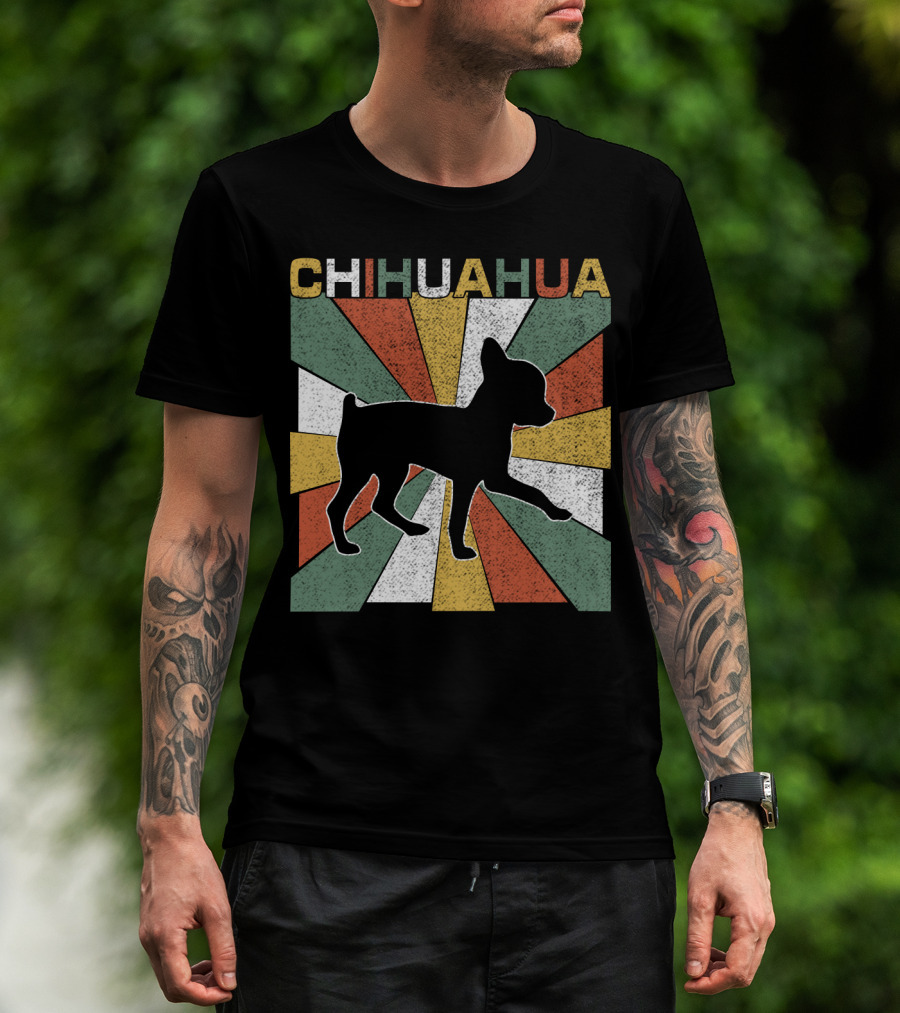 The Chihuahua Retro 70s Vintage Silhouette Burst T-shirt is designed for everyday wear and a consistent fit. Fabric is pre-shrunk ring-spun cotton with durable stitching. See the size chart below for exact measurements.