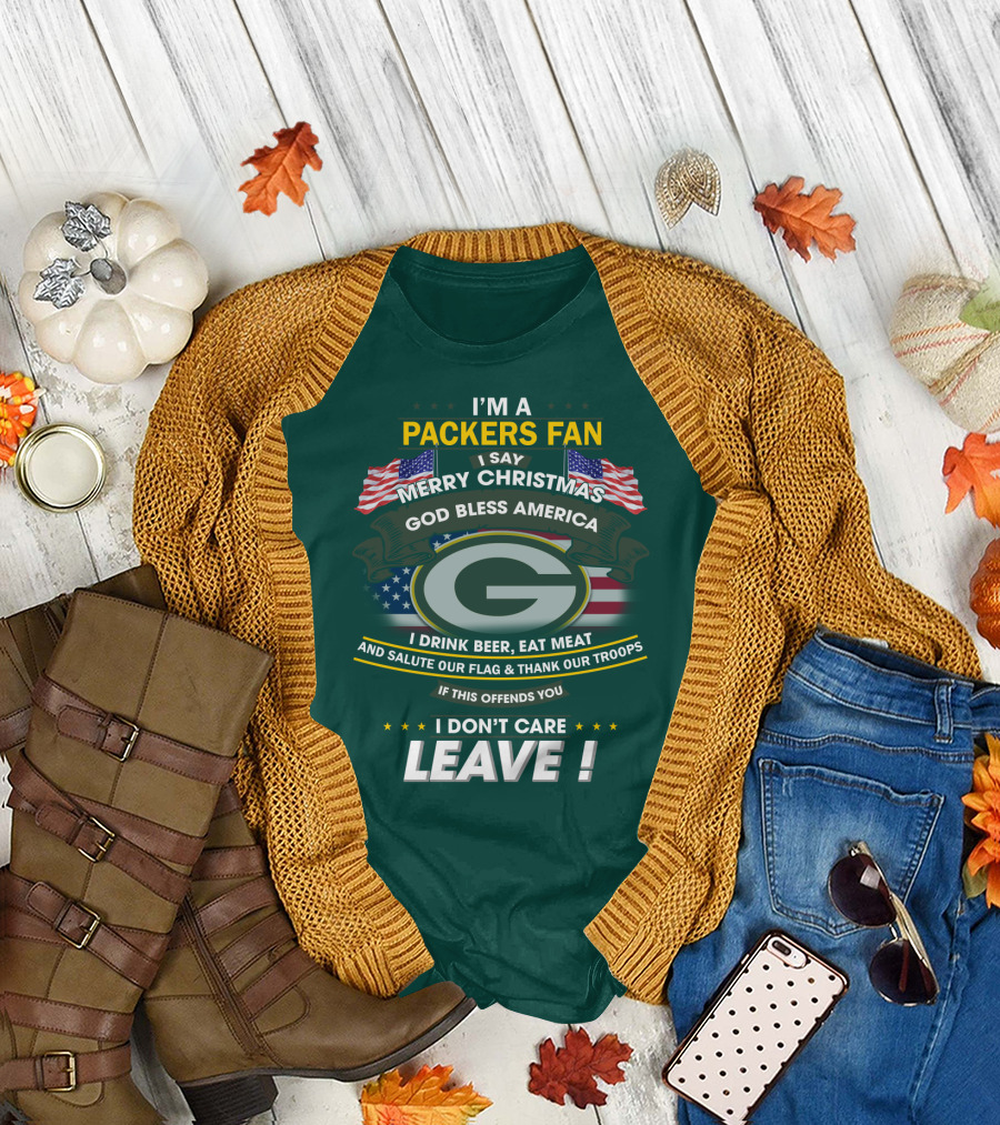 I'm A Packers Fan I Say Merry Christmas God Bless America I Drink Beer Eat Meat And Salute Our Flag And Thank Our Troops If This Offends You I Don't Care Leave T-Shirt