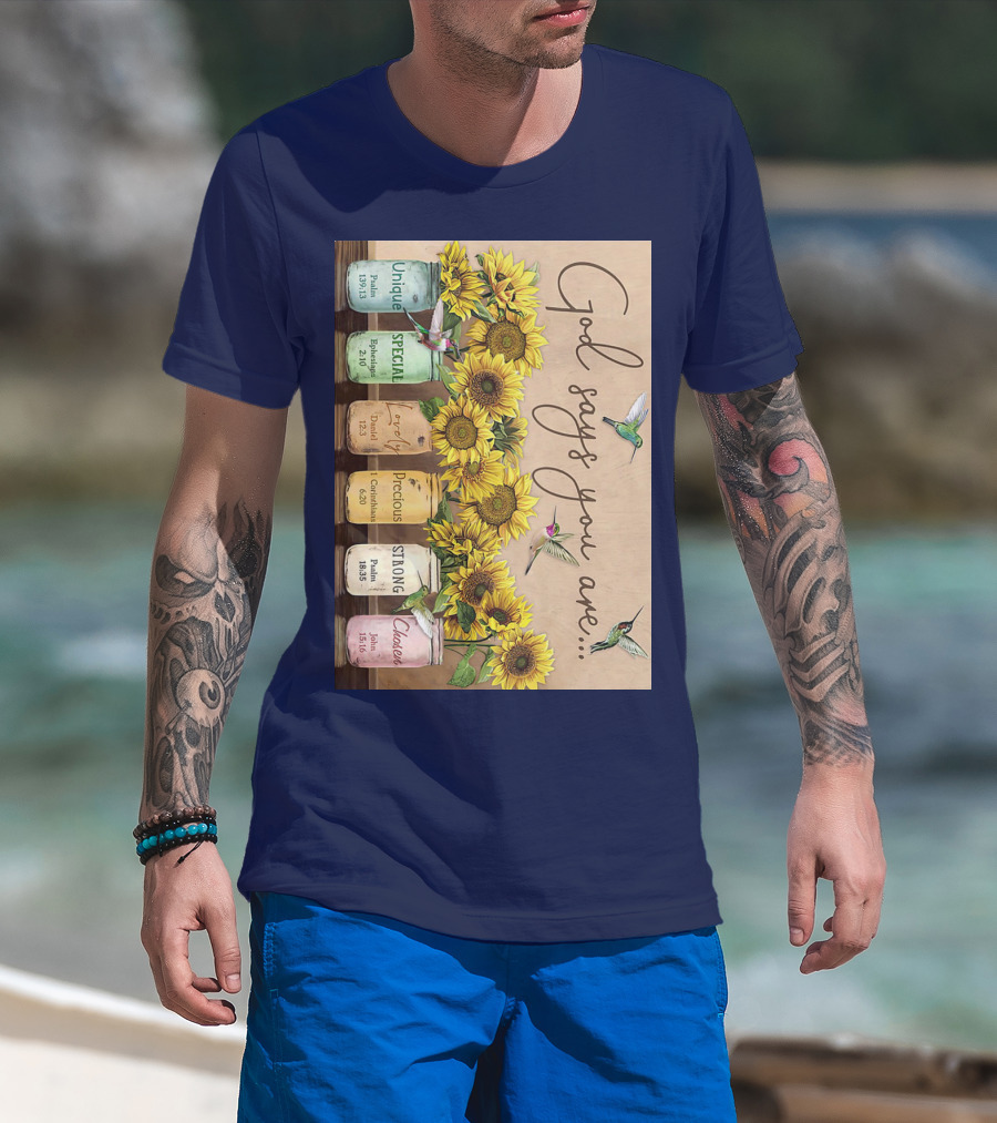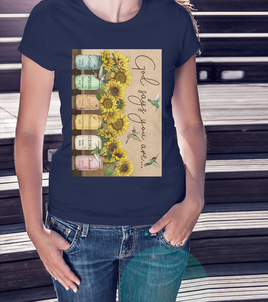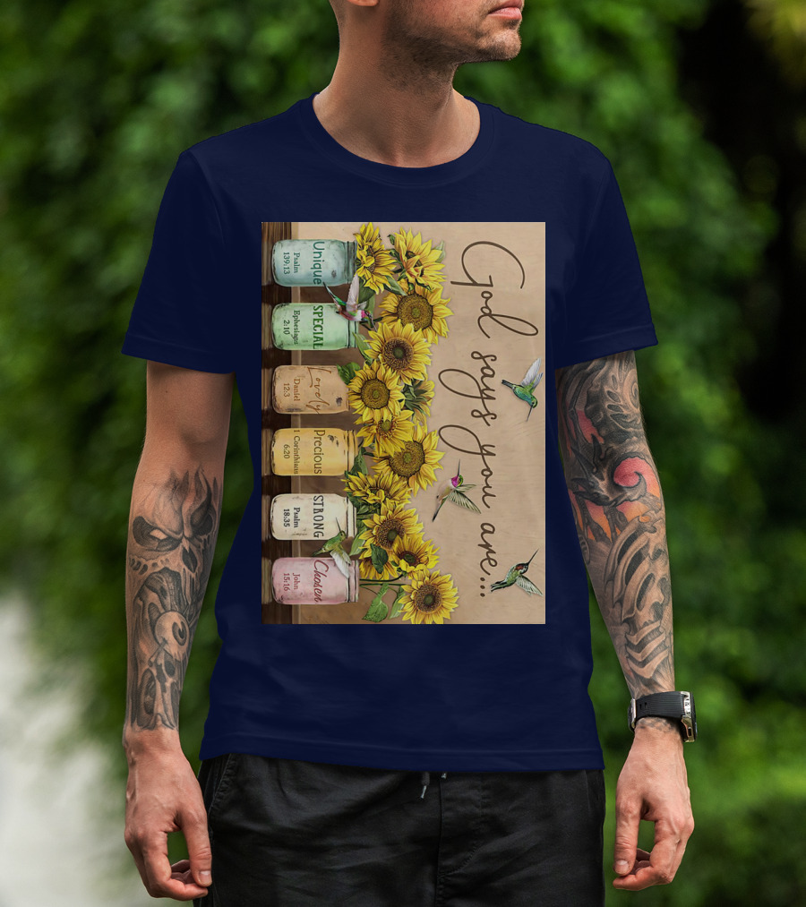 God Says You Are Unique Special Lovely Precious Strong Chosen Sunflower With Bible Verses And Hummingbirds T-Shirt