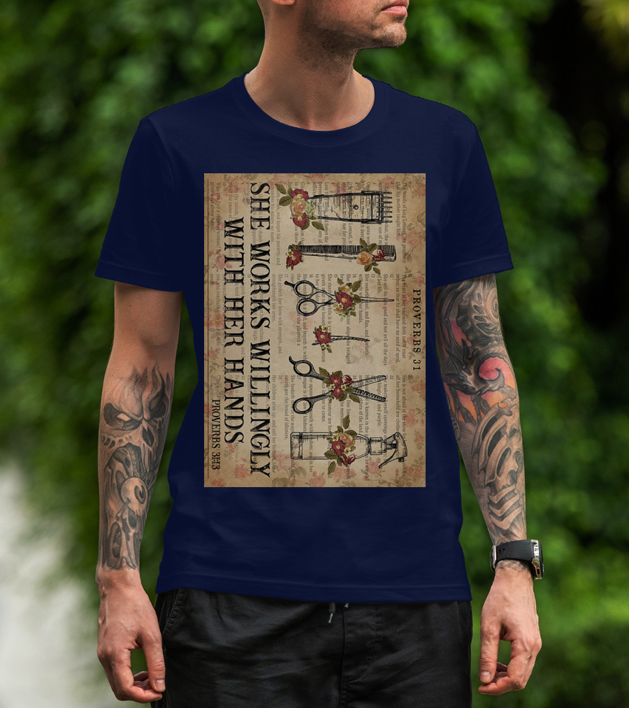 She Works Willingly With Her Hands Proverbs 31 Hair Stylist Tools And Floral Script T-Shirt