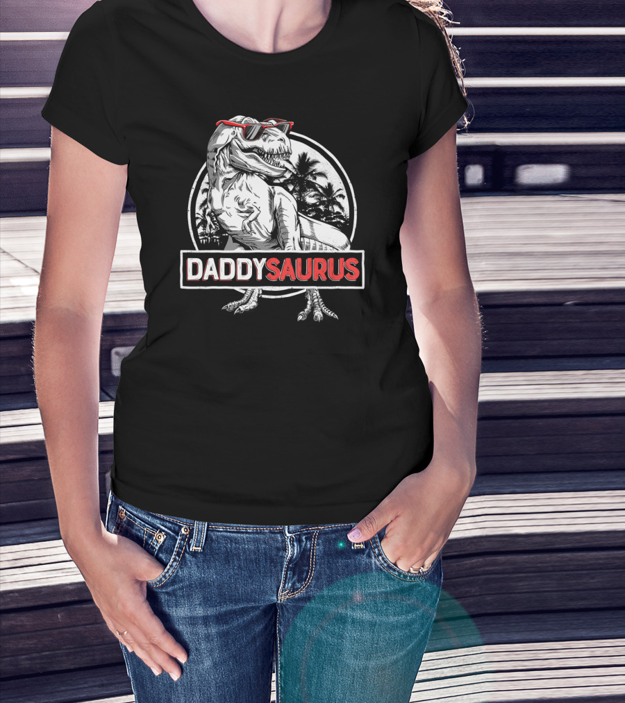Daddysaurus Rex Daddy Saurus Dinosaur With Sunglasses And Palm Trees T-Shirt