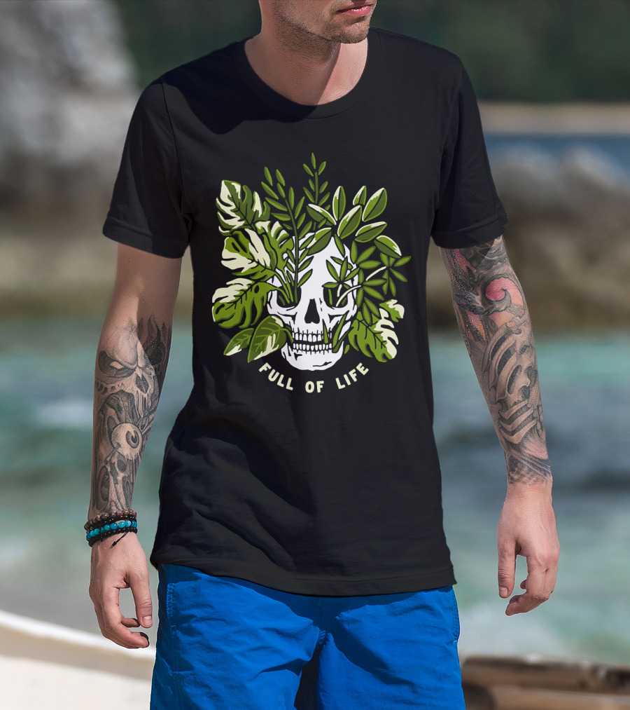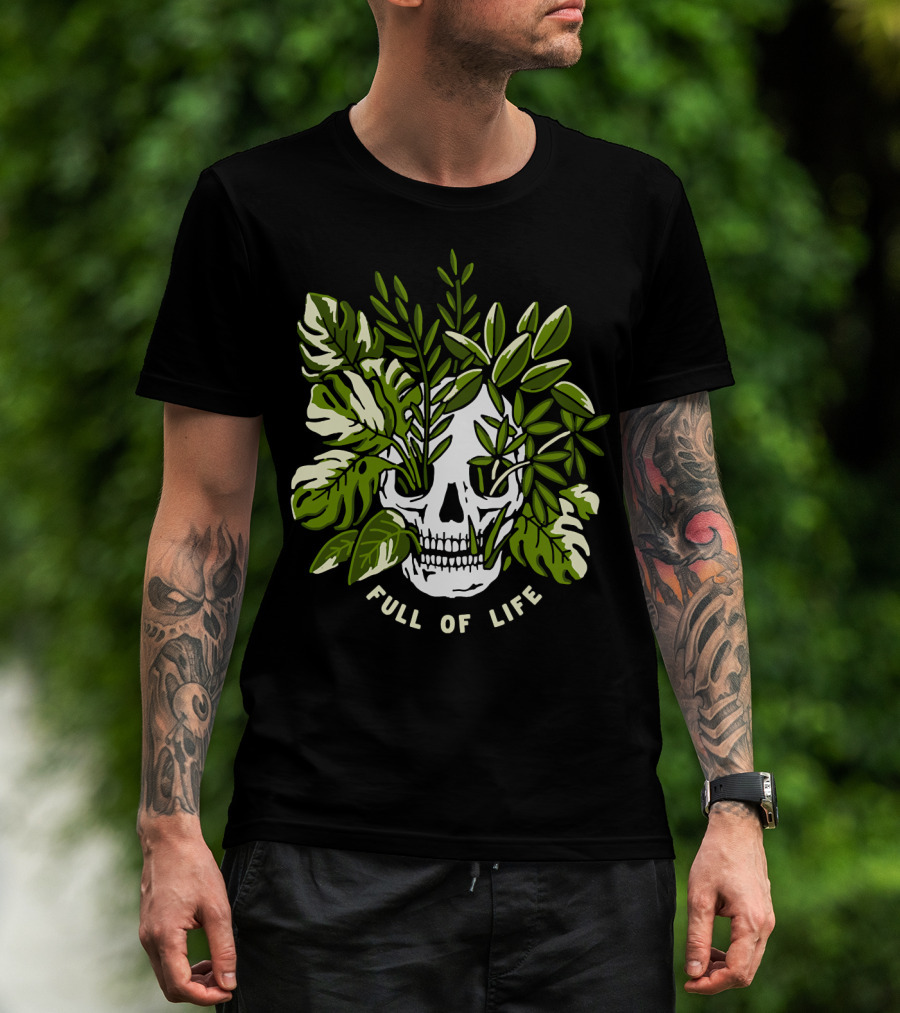 The Full Of Life Skull Tree With Green Leaves Bushes T-shirt is designed for everyday wear and a consistent fit. Fabric is pre-shrunk ring-spun cotton with durable stitching. See the size chart below for exact measurements.