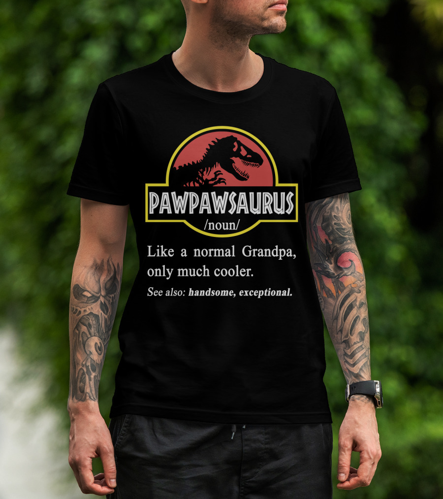 The PAWPAWSAURUS Like a Normal Grandpa Only Much Cooler See Also Handsome Exceptional T-shirt is designed for everyday wear and a consistent fit. Fabric is pre-shrunk ring-spun cotton with durable stitching. See the size chart below for exact measurements.