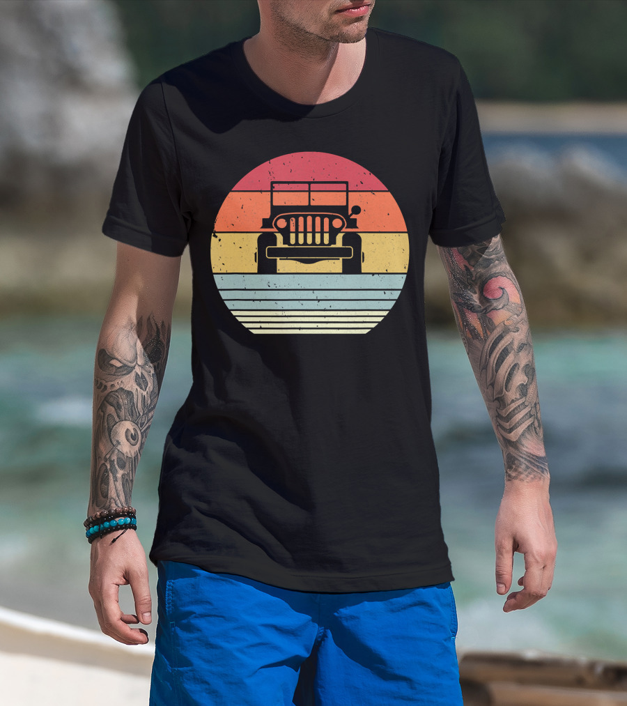 Retro Style Off Road 4X4 Vintage Jeep Silhouette Sunset Stripes T-Shirt