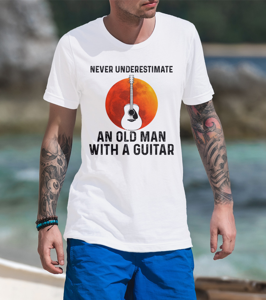 How much will this Never Underestimate an Old Man with a Guitar and Lunar Eclipse Background shirt shrink?