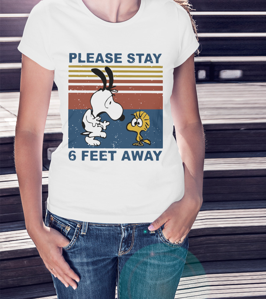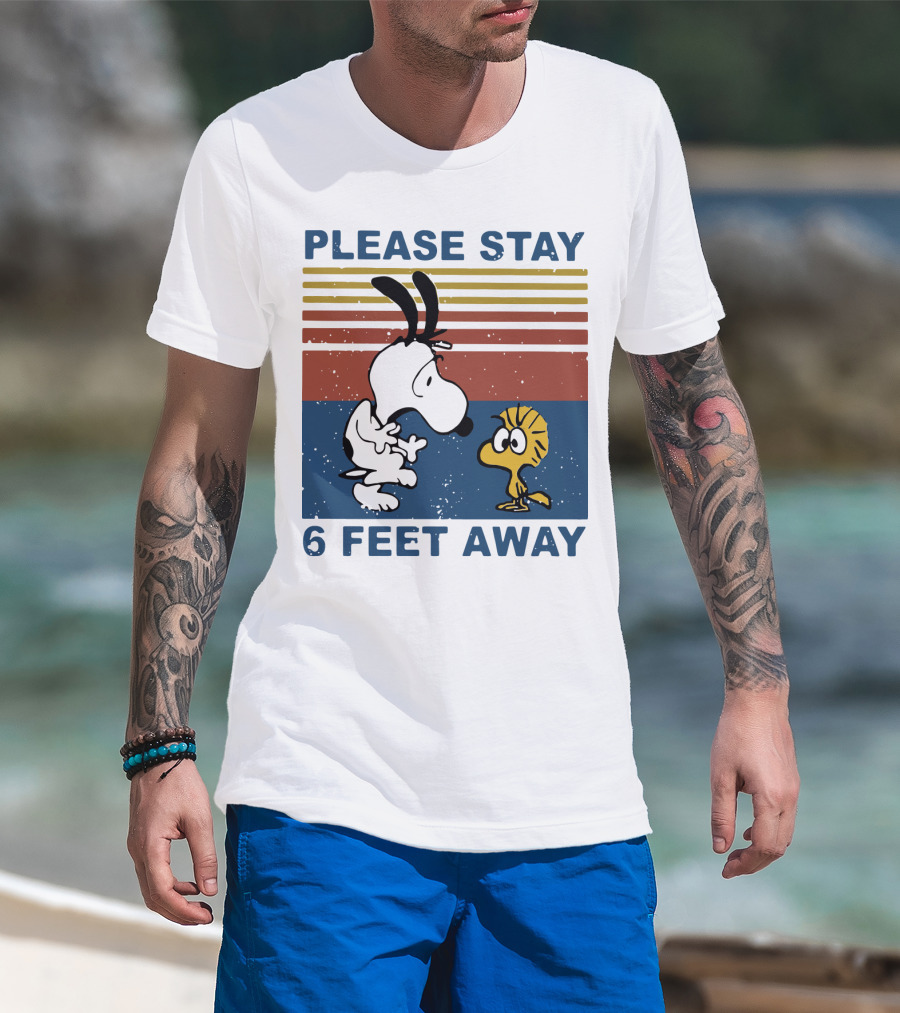 Vintage Please Stay 6 Feet Away Snoopy Woodstock Retro Stripes T-Shirt